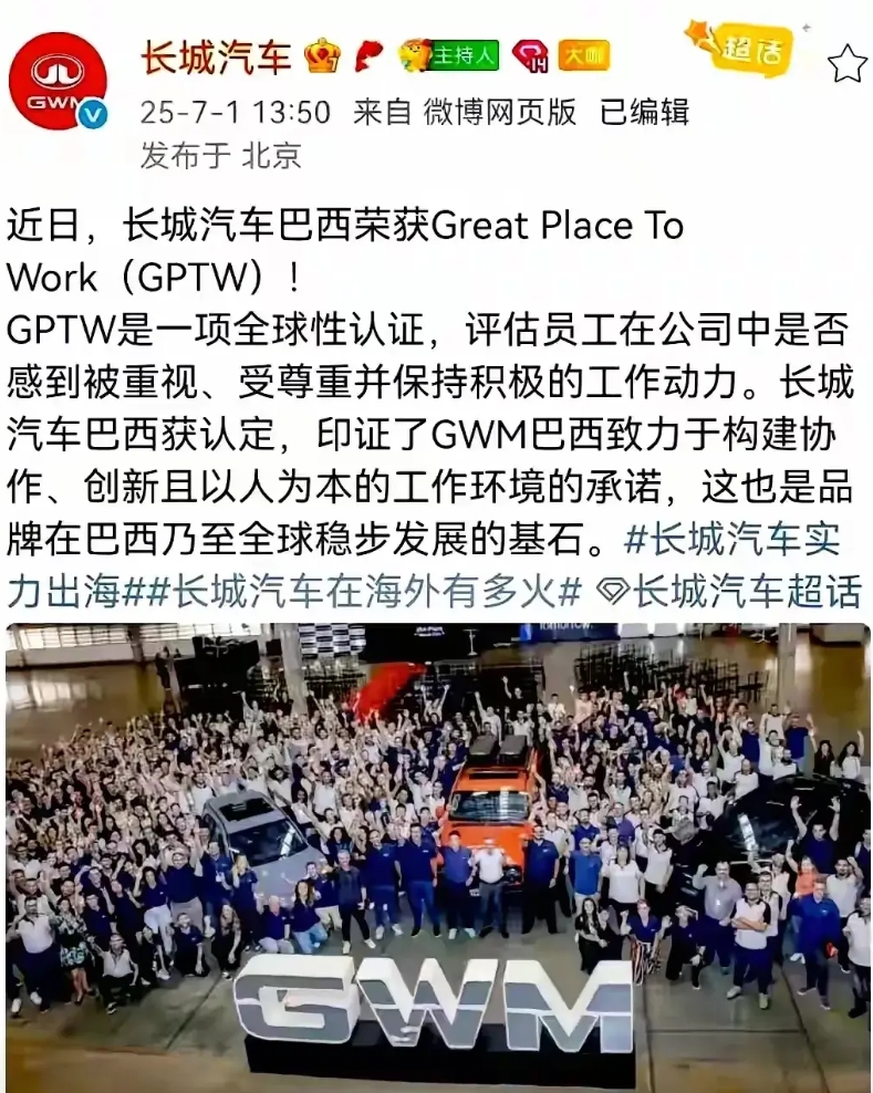 长城汽车的福利不错呀,国内外拉平! 近日,长城汽车发布通知,将放高温小长假,共计10天! 结合前段时间,长城汽车在巴西获得GPTW认证。长城汽车员工福利看来还是不错的!