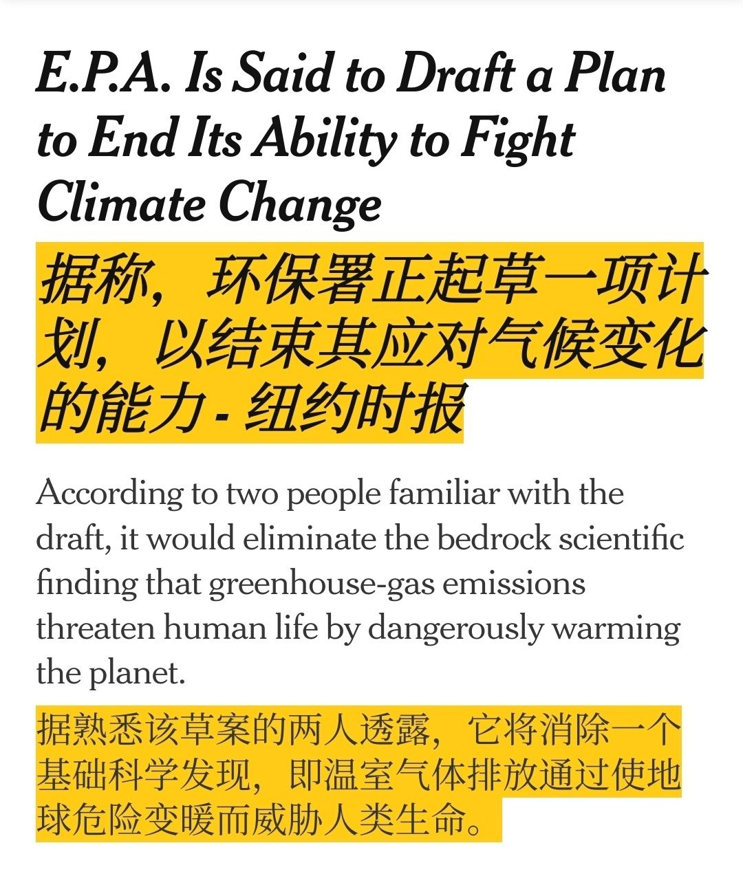 根据《纽约时报》的报道,美国环保署正在起草一份文件,计划解除对温室气体排放的限制