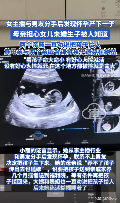 吉林长春,女主播与男友分手后,发现自己怀孕了,又舍不得打掉孩子,于是咬牙把孩子生了下来。可没想到,母亲、大姨和表姐因为嫌女主播未婚生子丢人,竟趁夜偷偷把婴儿丢在了人行道的树丛中,结果摊上事了。