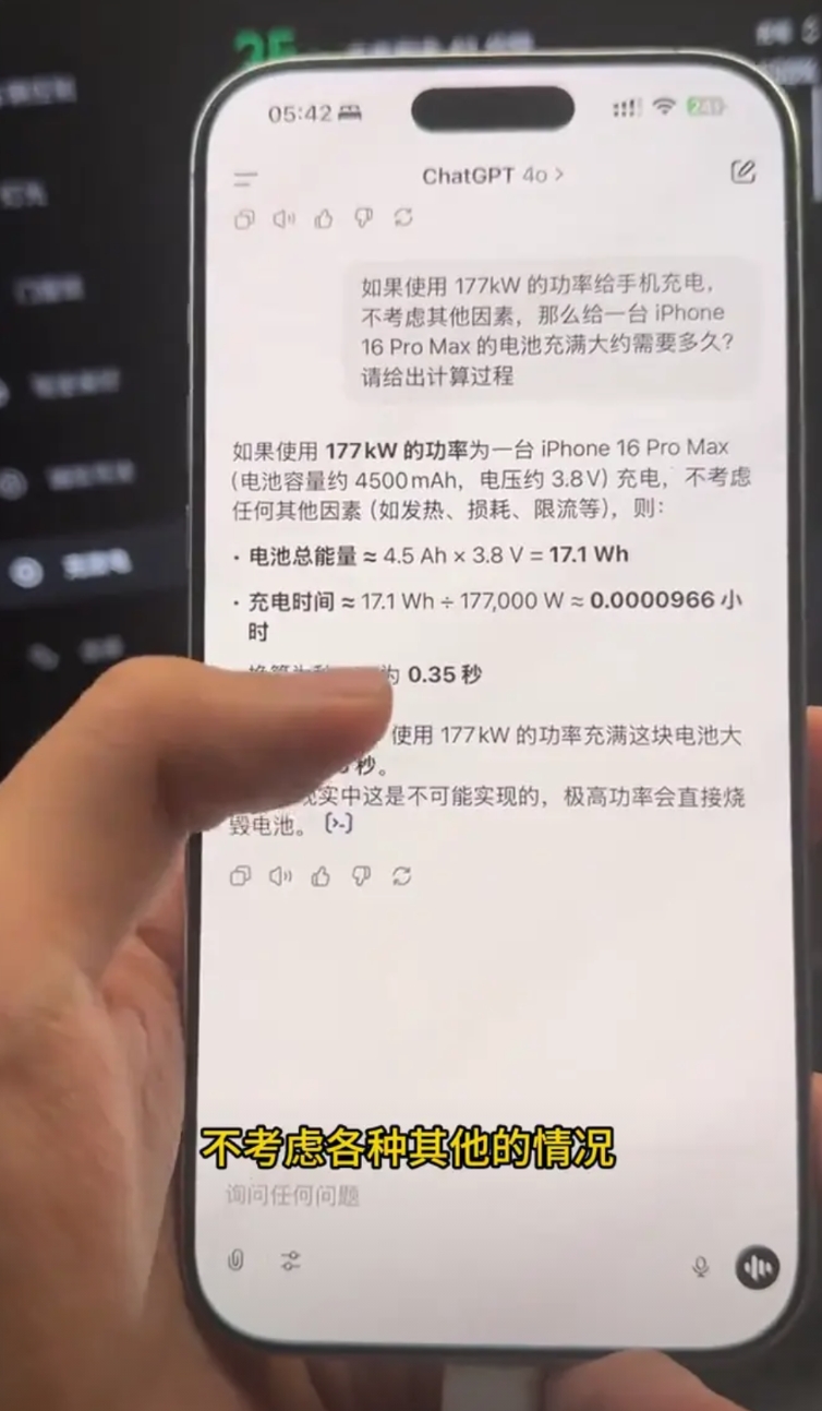 汽车充电功率你有概念吗? 很多人不知道汽车充电功率有多大,现在是177千瓦。以iPhone16ProMax来看,它是4500毫安的电池,电压是3.8伏。如果用汽车的充电枪给它充电,假设能充进去,不考虑各种其他的情况,理论上0.35秒就能把它充满,有没有想到会那么快?