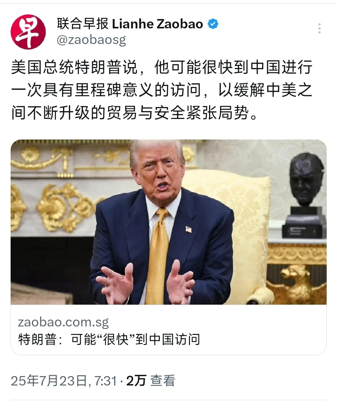 外媒今天(7月23日)报道:“美国总统特朗普表示,他可能很快到中国进行一次具有里