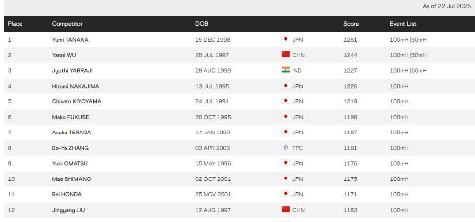 在芬兰坦佩雷举行的世界田联铜标赛上,日本30岁的女子100米栏名将中岛瞳以12秒71夺冠,成为第一位超过东京世锦赛12秒73标准的亚洲女子运动员,锁定一张世锦赛门票,这个成绩不仅是排名本赛季亚洲第一,也是日本历史第二好成绩,仅次于福部真子12秒69的全国纪录。而目前的该项目亚洲积分排名,田中佑美依然排名第一,吴艳妮第二,印度的亚拉吉第三,中岛瞳排在第四,仅比亚拉吉少1分,下周将上升到亚洲第三。