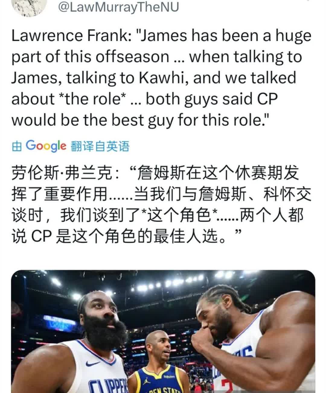弗兰克透露:保罗决定加盟快船之前,跟哈登进行了深入的交流,哈登盛赞保罗的职业精神