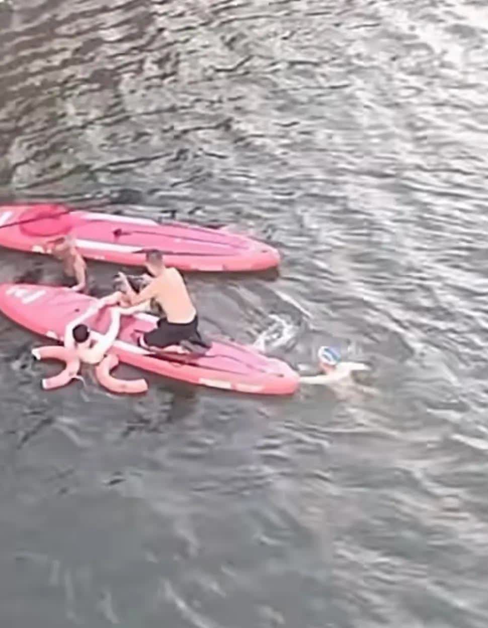 7月22日,锦州市凌河区东湖公园步行桥下有人溺水。 一个身穿白衣小伙,救人心切,毫不犹豫从十几米高的步行桥直接跳了下去! 游到落水者跟前,帮助落水者保持呼吸! 岸边的皮划艇爱好者也紧急赶过去,将两人成功拖离深水区。 上岸之后,大家对落水者进行了急救。 而救人的小伙子(图一、图二),累瘫在地。而且他也受了一点伤,目前已住院治疗。 真是好样的,给锦州争光!