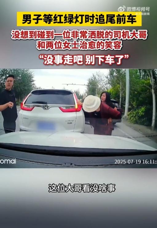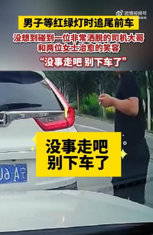 “格局打开了!”7月19日,宁夏银川,男子等红绿灯时玩手机,忘踩刹车追尾前车,前车下来3个人后,男子慌得不行!以为要摊上事了,没想到,大哥看了看追尾的地方,然后说了句:“没事,走吧,别下来了!” 当时路口红灯,后面的车停着等信号,开车的小伙低头看了眼手机,也就几秒钟的功夫,脚没踩着刹车,车子“哐当”一声,轻轻撞上了前面的小轿车,小伙心里“咯噔”一下,完了,这得赔钱修车了! 他赶紧解开安全带,想下车道歉,这时候前车车门打开,下来三个人,两女一男,脸上都带着笑,一点没着急的样子,带头的大哥走到车尾,弯腰看了看被撞的地方,又抬头冲小伙摆手:“没事没事,走吧走吧,别下来了。” 小伙都懵了,还以为自己听错了,大哥笑着摆摆手:“真不用,就轻轻碰了下,掉点漆不碍事,赶紧走,别挡着后面车了。”说完跟车上的人笑着回了车,一脚油门就走了。 这一幕被车的记录仪拍下来,发到网上,网友们都炸了:“这大哥格局太大了,换我可能得先瞪两眼,你看人家一家人,下来都是笑着的,一看就是面善的实在人。” 还有人说:“现在路上剐蹭点小事故,多少人能吵半小时,这大哥三句话解决,爽快”,也有网友分享经历:“上次我被人追尾,对方小姑娘吓得快哭了,我说没事她还不放心,非留了两百块,其实真不用。” 其实啊,路上开车谁还没个小磕碰,有时候就是一脚刹车没踩稳,或者分神半秒钟的事,真没必要得理不饶人,能笑笑过去的事,犯不着伤和气。 信息来源:《男子等红绿灯追尾前车没下车》大皖新闻