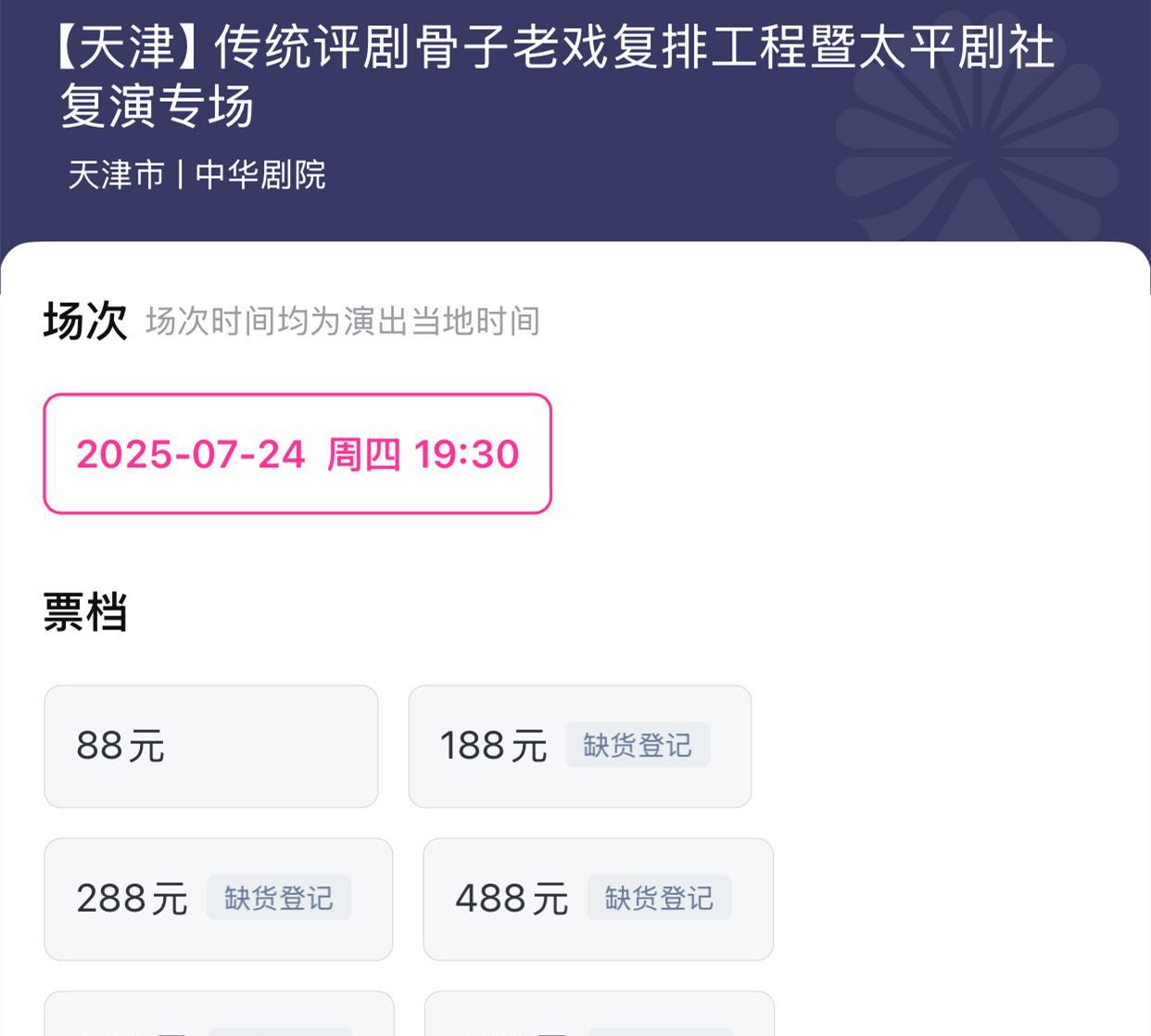 德云社太平剧社复演将要在7月24日在天津中华剧院与观众见面。随着演出的临近,大家也比较关心,太平聚车复演的演员阵容、票房等如何?从郭德纲的介绍可以获悉,登台的都是老艺术家,最年轻的七八十岁,还有九十、九十一。可以说,实力是很强的。从大麦网可以获悉,太平剧社复演的票房还是有保障的。剧场提供了750个座位,门票价格分6个档次,最低档88元的还有二十多个座位没有售出,其余档次的门票全部售罄。看得出,观众对德云社太平剧社的复演还是很支持的。 #德云社太平剧社复演票房有保证#
