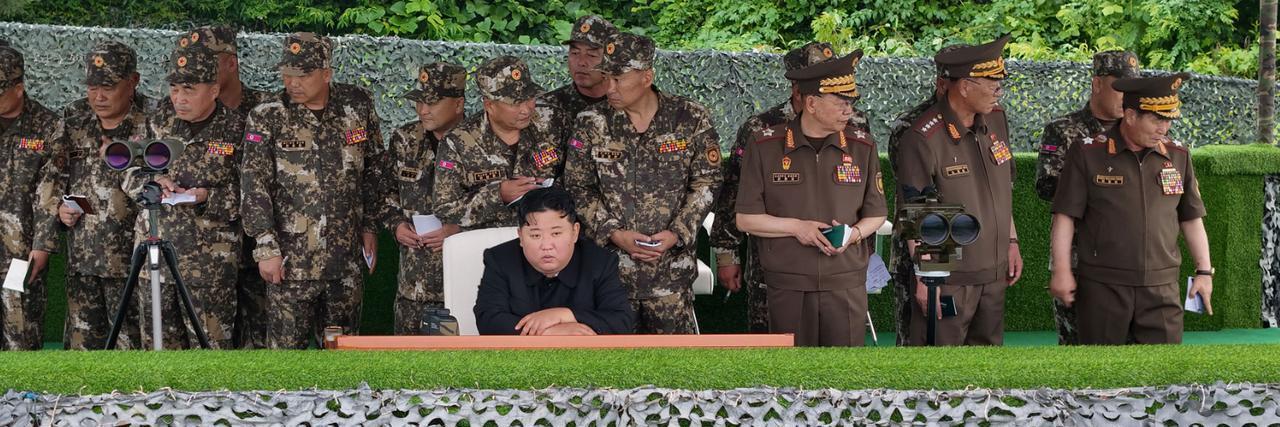 金元帅近况照片:观摩各大联合部队火炮射击训练。 时间是7月23日。 朴正天、卢光哲、李英吉及各级军政司令员陪同视察。 金元帅来到现场,听取了炮兵射击训练比赛筹备情况汇报,并强调了按照总参谋部计划开展训练比赛的重要。 金元帅指出:我们革命武装力量核心兵种的战斗力要达到高度完善和无敌状态。我们自己的炮兵战术和作战方法要不断创新和彻底发展,以适应日益变化的现代战场严酷而尖锐的环境。