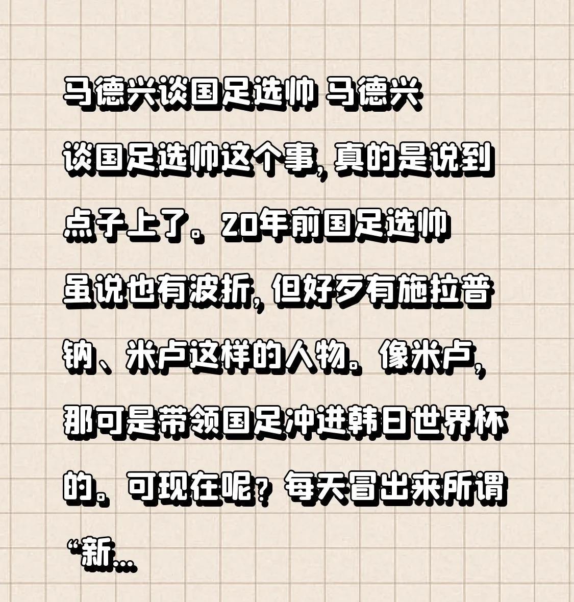 马德兴谈国足选帅马德兴谈及国足选帅这事儿啊,那可真是一针见血。20年前国足选帅