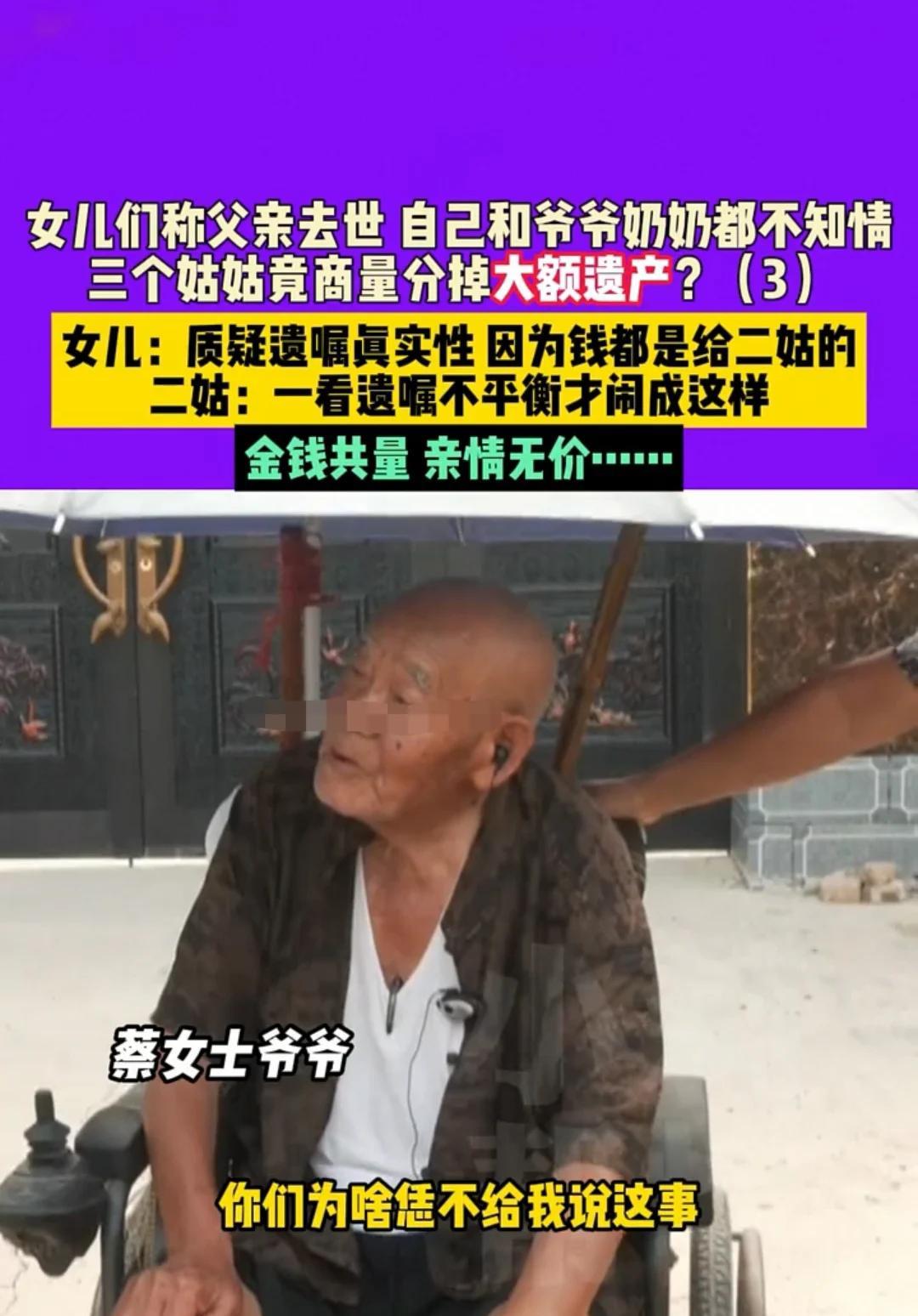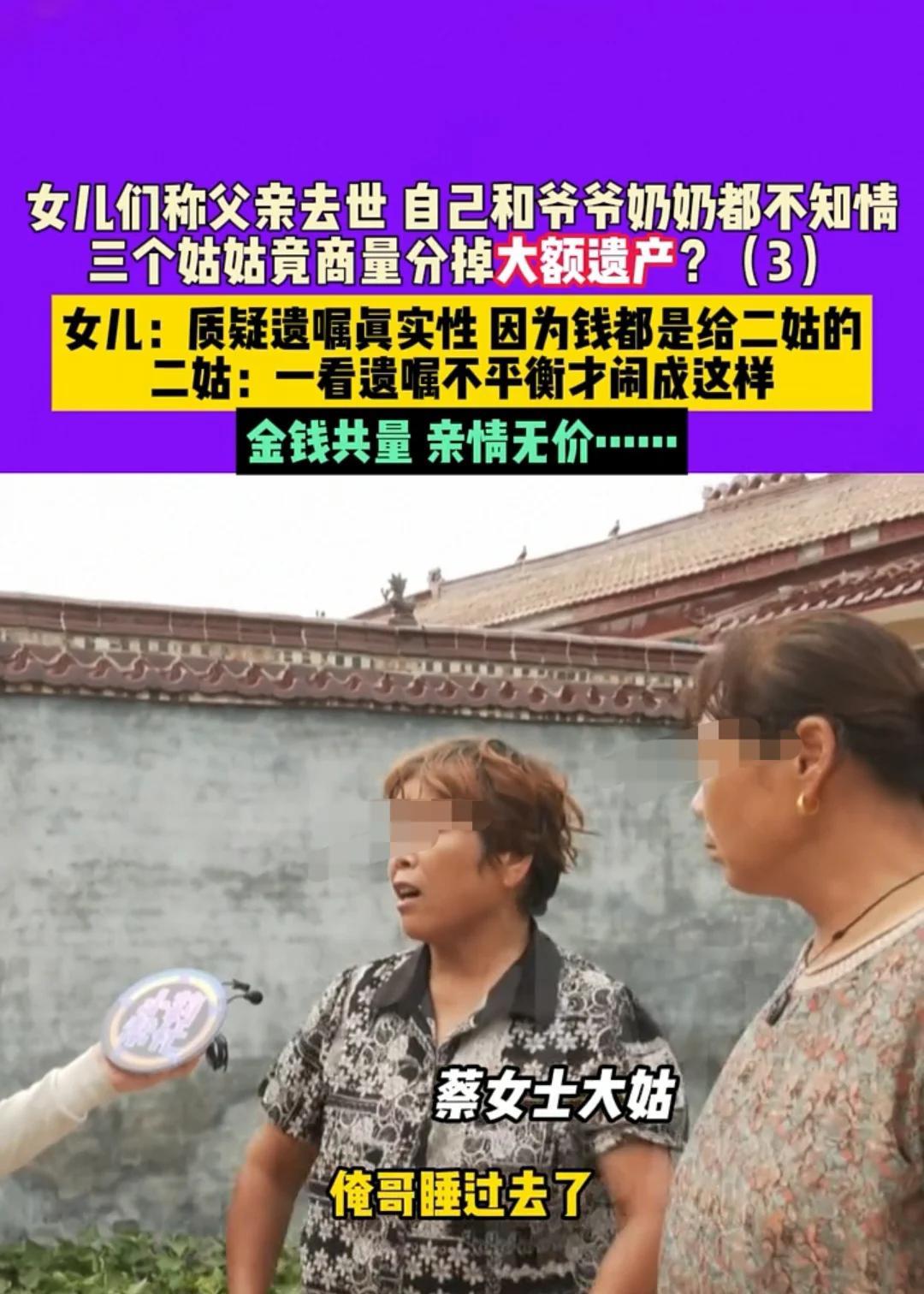商丘,女子的父亲意外离世,她和爷爷一起长大。父亲离世后,二姑没有告诉她和爷爷,还伙同大姑和小姑一起将父亲的财产分割了。后来,小姑良心发现,赶紧告诉了女子。当女子上门讨要说法时,二姑却说是大姑不让说的;而大姑则说,二姑连自己哥哥离世都不知道,当时还睡着了,是二姑自己不让说的。 据河南民生频道7月22日报道,蔡女士突然接到小姑的电话:“你父亲离世了,你怎么还不来看一看啊?” 蔡女士一听,犹如晴天霹雳。自己的父亲和母亲离婚多年,她一直跟着爷爷长大。虽然她和父亲的关系不是太好,但每年父亲回来看爷爷时,一家人都会和和睦睦的。父亲离世,怎么会都不告诉自己呢? 于是,蔡女士和自己的姐姐火急火燎地赶往医院,可父亲冰冷的身体已经送往火葬场了,她们连最后一面也没见着。 在悲痛之余,蔡女士把消息告诉了爷爷。那可是爷爷唯一的儿子,爷爷得知几个女儿没有告诉自己,心中的怒气一直消不了,拿着儿子的遗物捶胸顿足地说“恨了,恨了”,他说的是恨自己的几位闺女。 后来,蔡女士把父亲的后事安顿好后,二姑站出来说,大哥的所有财产都留给了自己。 蔡女士很震惊:自己和姐姐才是父亲的女儿,怎么财产都留给二姑呢?她不相信。 可二姑拿出了当时大哥签的遗嘱,上面写着财产绝大多数确实留给自己,剩余的一小部分给到大姑和小姑。 蔡女士难以置信,询问大姑和小姑知不知道这回事? 这时,大姑和小姑也不满意,直接说不知道这回事,并且还指着二姑,说当时是二姑不让告诉蔡女士的,理由是“蔡女士拿到钱肯定就会走,到时候没人照顾大哥,还不是我们仨姐妹的事”。 不过,二姑却指责大姑说,是大姑不让告诉蔡女士的。 站在旁边的二姨夫也对着在场的所有人说,这是他们仨姊妹一起协商下的决心。 小姑心中不服,对天发誓:“我可没有让大家不告诉蔡女士,我可不愿意分大哥的财产,这本来就不属于我们。” 后来,二姑心中埋怨道,大姑和小姑看到大哥的财产绝大多数留给自己,他们心中不满,所以才撺掇蔡女士向自己讨要说法的。 蔡女士质问二姑:“你凭什么继承我爸爸的财产?哪条法律规定你有理由继承我爸爸的财产?” 二姑却表示:“这个遗嘱不是我逼着你爸爸写的,是他自己写的,在场的还有两位律师。” 不过,大家让她把律师的电话号码告知出来,她又不愿意。最后,爷爷站出来说:“这个官司就不打了,大家坐下来好好协商。虽然我恨他们,但是都是一家人,别让别人看笑话。” 最后,几姊妹也向父亲赔礼道歉,说哥哥离世没有告诉他,是他们不对,但关于财产,还是之前的说辞——就是哥哥留给自己的。 最后,蔡女士决定走法律程序,夺回自己和爷爷的财产,因为她和爷爷才是父亲的第一继承人。至于那份遗嘱,他们合理怀疑是二姑作假。 一、几位姑姑是否有权利继承大哥的遗产? 根据《民法典》规定,配偶、子女、父母是第一顺序继承人,兄弟姐妹、祖父母、外祖父母是第二顺序继承人。继承开始后,由第一顺序继承人继承,第二顺序继承人不继承。 在事件中,蔡女士和姐姐作为大哥的子女,是第一顺序继承人,因此在有第一顺序继承人的情况下,几位姑姑作为第二顺序继承人,通常没有权利继承大哥的遗产。 二、 二姑手中的遗嘱是否有效 ? 根据《继承法》第二十二条规定,无行为能力人或限制行为能力人所立遗嘱无效。遗嘱必须表示遗嘱人的真实意思,受胁迫、欺骗所立的遗嘱无效。伪造的遗嘱无效。遗嘱被篡改的,篡改的内容无效。 如果二姑手中的遗嘱是大哥真实意思表示,大哥立遗嘱时具有完全民事行为能力,且遗嘱内容不违反法律规定,处分的是大哥个人合法财产,那么遗嘱有效。反之,若存在上述无效情形,则遗嘱无效。 三、如果二姑作假负不负法律责任 ? 二姑如果伪造遗嘱,需要承担法律责任。民事上,根据法律规定,伪造的遗嘱无效,遗嘱无效部分所涉及的遗产,应按照法定继承办理。 行政上,在一些特定情形下,伪造遗嘱行为还可能违反治安管理处罚法等相关行政法规,相关部门可对其处以行政拘留、罚款等行政处罚。 对于这件事,大家又是如何看待的呢?#头号创作者激励计划##分享城市新鲜事#