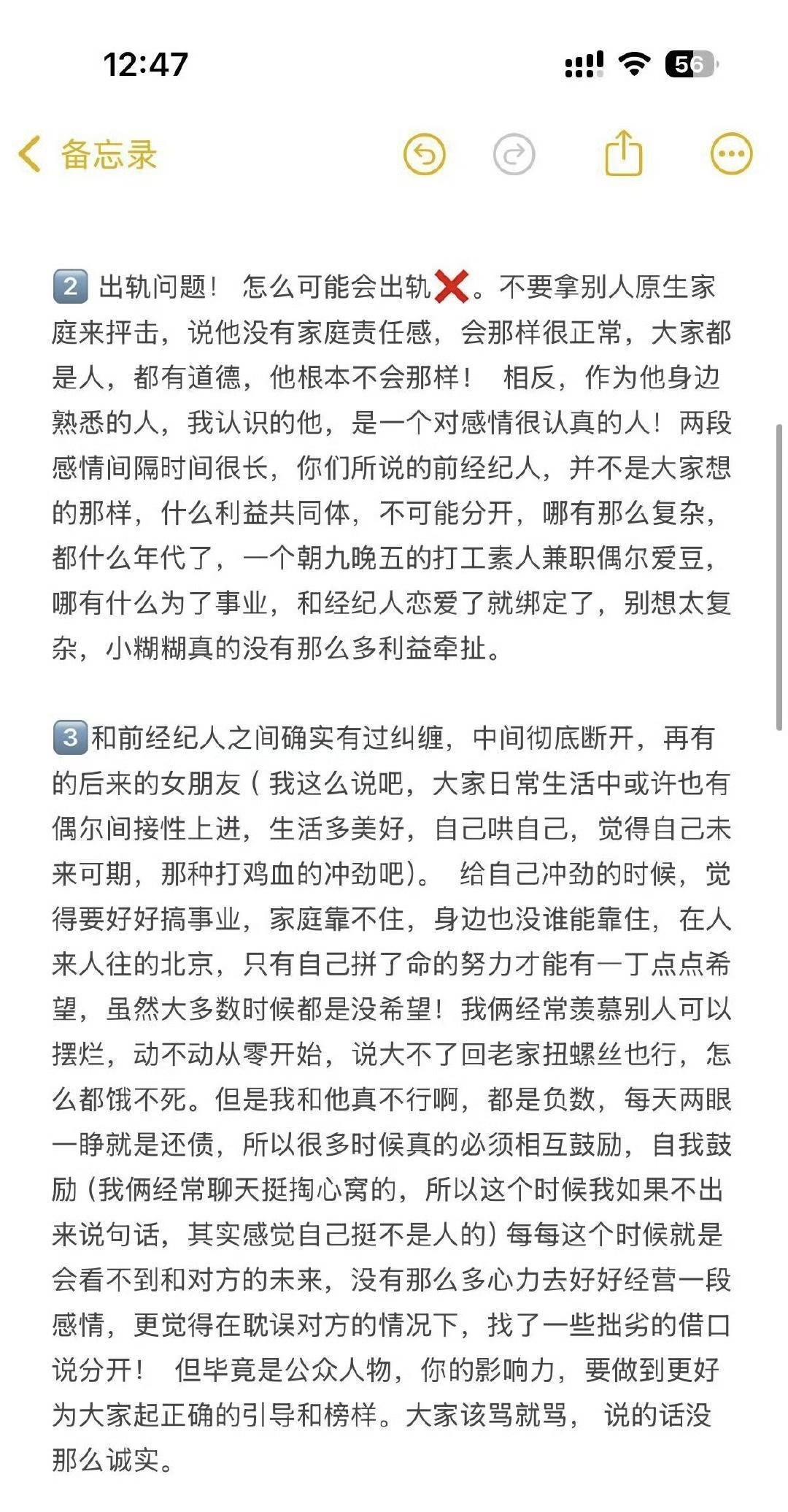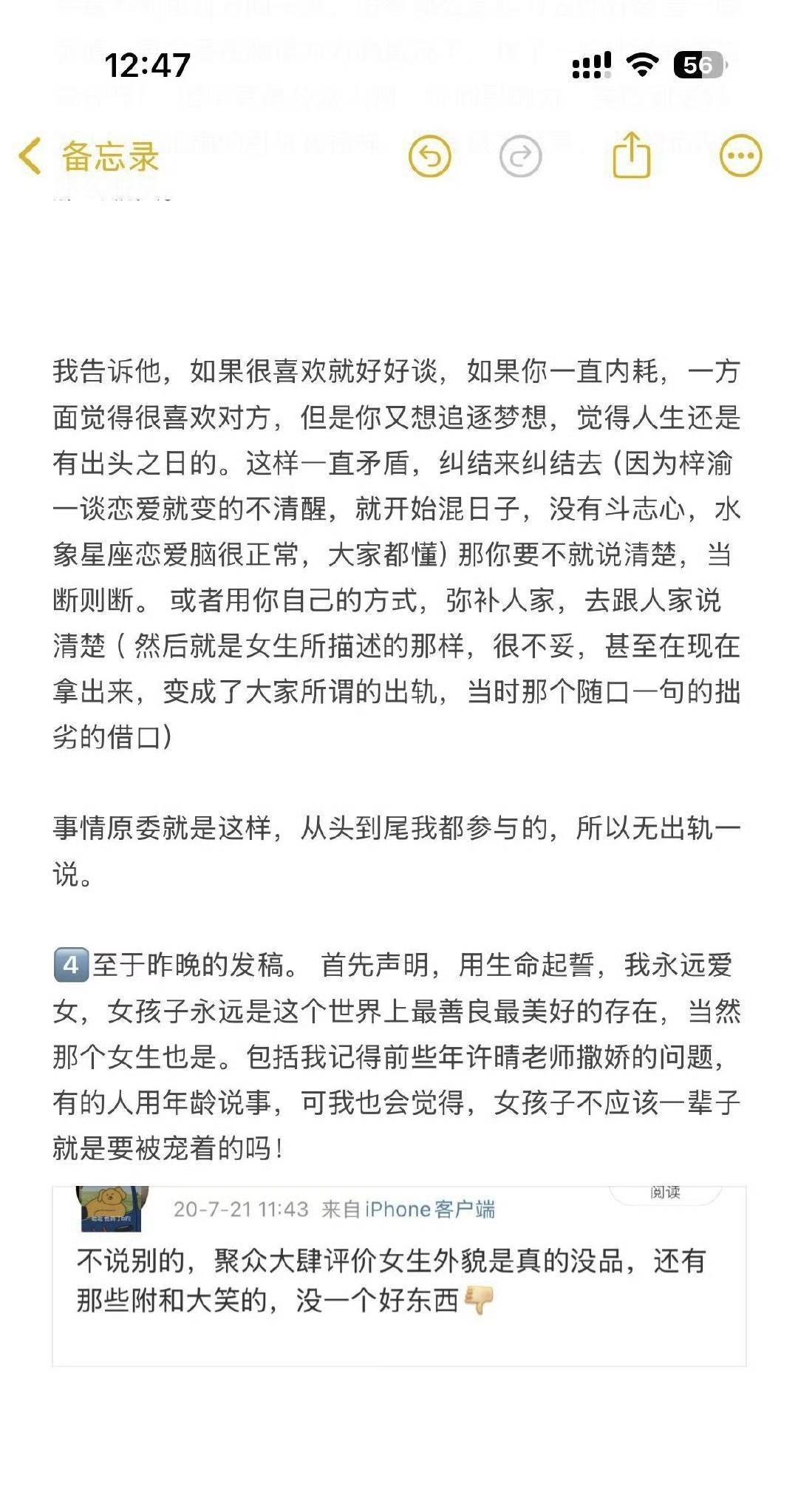 自称是梓渝朋友的网友发文,总结如下: 确实恋爱了、否认出轨、和前经纪人有纠缠、这