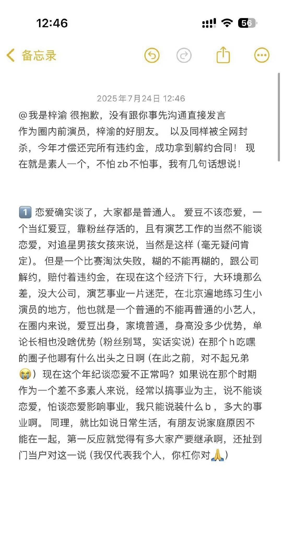 自称是梓渝朋友的网友发文,总结如下: 确实恋爱了、否认出轨、和前经纪人有纠缠、这轮“黑”他的会来势汹汹、疑似暗搓搓内涵他女友(“不会对女生说三道四但别把自己形象搞得太好”)