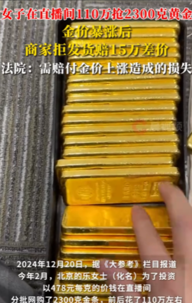 2024年2月23日北京女子趁着金价形势大好,在网上花110万买了2300克金条,结果金价一路狂飙商家立马变脸说库存不足发不了货只肯赔一百块让她退款,她火了直接起诉,现在法院把账算清了,目前该事引发持续关注。 她说我是在淘宝“香菇来了”直播间下的单,kingboom牌子,478元一克,分了几笔凑到2300克,总价109.94万。 金价蹭蹭往上跑那几天,她天天刷物流,页面一直“备货中”,客服抛一句您理解一下库存紧张再赔您100元,她回了仨字不接受。 商家最后摊牌,我们愿意承担违约责任,但货是发不了的,她回一句我不是要你一句话,我要的是我的金条或者我的损失。 据潇湘晨报·晨视频报道(2025年7月),她把聊天记录、订单号、金价走势图全打包提起诉讼,请求按合同履行或赔差价外加利息。 一审法院把合同关系、金价涨幅、下单到违约的时间点都理了一遍,认定商家违约,裁定解除合同,退她109.94万元本金,再赔15.64万元价差损失。 商家不服上诉,说她的金条已使用市场折旧应按当日评估值算,我们认栽但不该补这么多。 二审法官当庭问一句,你们既然“认栽”,那为什么又把货在2024年3月底全发出去了,还没把承诺的现金补偿打过去,商家沉默。 最终二审维持原判,合同解除、退款返还、差额赔偿,写得明明白白,她拿到判决书说我理财计划被你们打乱的每一天都在亏,这回总算有人给我算回来了。 她在社交平台把判决主文几行字圈成红框,说别再给我100块钱“安慰”,我需要的是契约。 商家后来又打来电话说愿意协调新的解决方案,她回一句我只接受判决书里的方案,别再讲折旧故事。 她把二审裁定寄给平台方,要求同步对店铺进行诚信处理,平台客服回她我们会依据规则评估,你等通知,她说我等,但我会把过程继续晒。 律师提醒她执行阶段要盯紧到账时间与金额差额,她点头把执行申请、利息计算表又多打印两份,说我怕你们再说算错了。 目前暂无进一步公开执行细节,赔偿与退款落地情况平台未披露,事件仍在执行阶段推进中。 信息来源:潇湘晨报·晨视频。你怎么看。