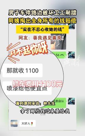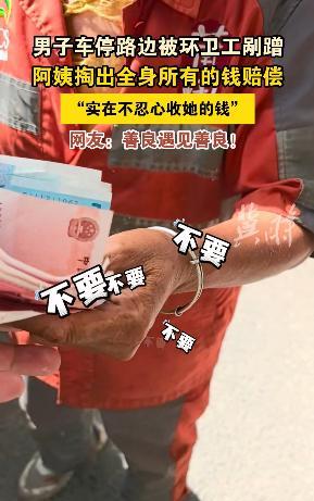 “活该他发财!”7月23日,福建莆田,男子把车停在路边等人,结果,环卫阿姨不小心剐蹭到了男子的车,男子经过询问,修车需要1100元,可阿姨一个月的工资才只有一千多,男子实在不忍心让她赔偿,就让阿姨离开了!网友:都是善良的人。 这年头,干点什么都不容易,有时看到别人遇到困难,也不是自己不想帮忙,而是实在没有能力。 事发当天,林先生开车在路边等人,过了一会儿,一名环卫阿姨骑着三轮车路过,结果由于靠得太近,三轮车上的东西不小心剐蹭到了林先生的车子。 林先生过来查看情况,并拍照发给4S店询问维修费用,对方告知一共需要1100元。 阿姨听到要这么多钱后非常着急,急忙翻出身上的所有钱递给林先生,但是远远不够修车钱。经过了解,原来阿姨每个月才只能赚一千多块钱,这笔修车费用都快赶得上阿姨一个月的工资了! 林先生心里也不是滋味,不忍心收阿姨的钱,再加上阿姨的态度非常好,并没有逃避责任,最终他让阿姨离开了。 林先生的行为得到了网友们的一直好评,赞叹他是个善良的人,还有细心的网友发现阿姨的鞋子和衣服十分破旧,想要给阿姨买新衣服送去,林先生表示,先替阿姨收下这份心意了,他打算自己给阿姨买些衣服送过去。 不多不说,世上还是好人多啊,大家对于这件事是怎么看? 信息来源:《环卫阿姨剐车道歉掏现金赔偿车主婉拒》河南之声