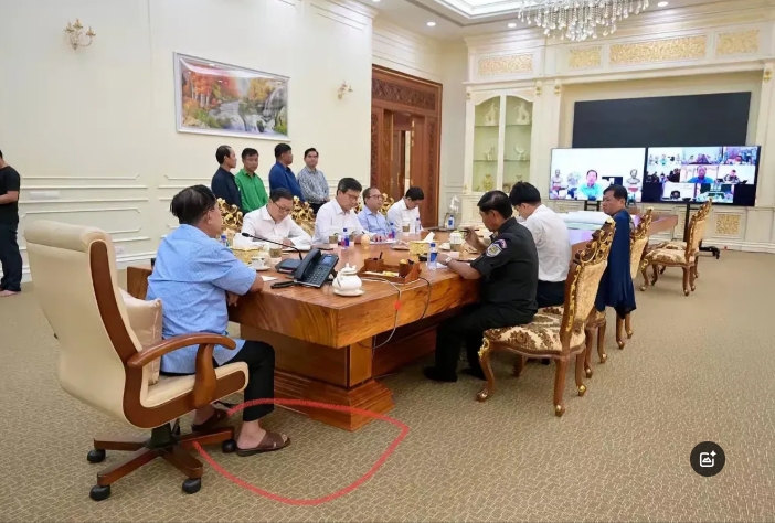 洪森这松弛感拿捏到位!只见他穿着双拖鞋稳坐C位,面前摆着一杯星巴克咖啡,神情从容,不慌不忙的开着会,并以视频会议的形式给前线发布相关指令。