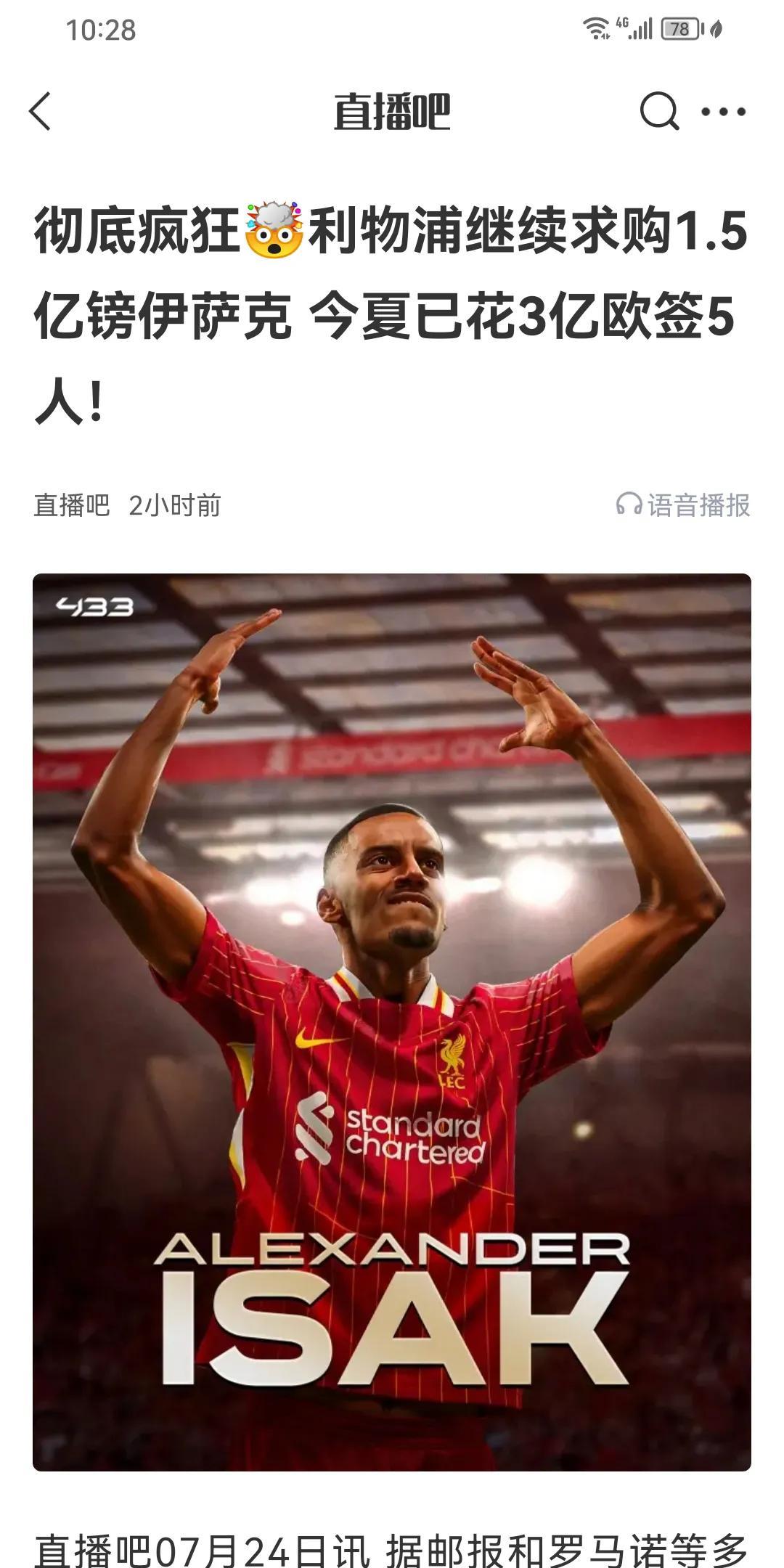 这下利物浦真大结局了吧?伊萨克+埃基蒂克+维尔茨简直无敌了。 要是利物浦再拿下罗德里戈和格伊,那就可以提前开香槟了。 本来以为利物浦买了埃基蒂克今年转会就差不多了吧,没想到现在又花1.5亿继续报价伊萨克了。 不过仔细想想,利物浦没了若塔,如果再把努涅斯和迪亚斯卖了,那锋线补个埃及迪克和伊萨克也算合理。 这个夏窗利物浦的球迷跟做梦一样,就像穷了好多年的家庭,突然中了10个亿的感觉。 我觉得下赛季的英超比欧冠还刺激……
