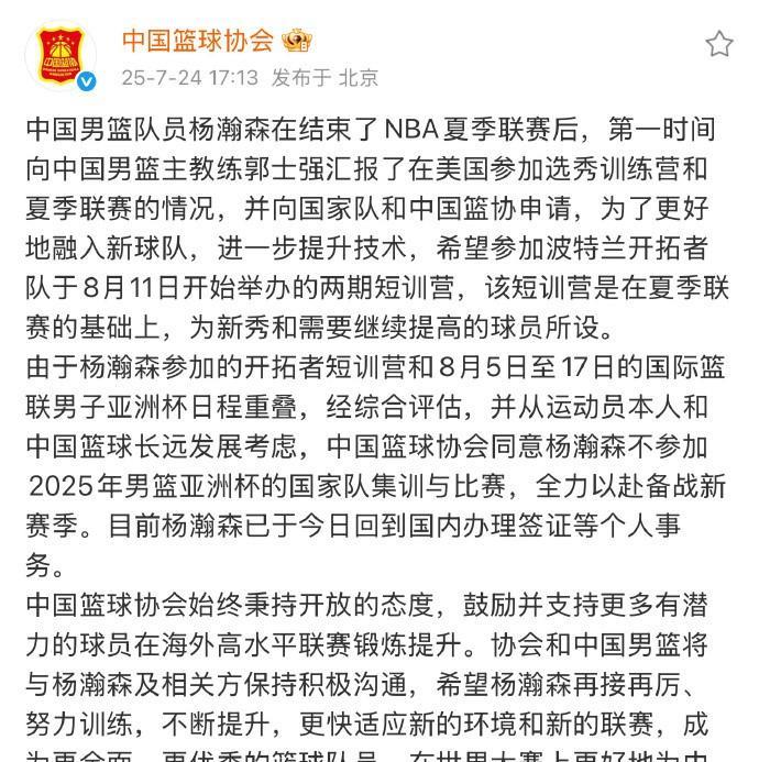 好消息!篮协公告:杨瀚森不出战亚洲杯,将返回开拓者训练营。 哈哈,领导们被日本队3主力不打吓到了,上了还输就真的没退路、没借口。 (我4点才说可能会撤回杨瀚森,真就撤了) 对杨瀚森个人和中国男篮未来倒是超级利好。他在NBA打出名堂,才能更好的帮助国家队。 大家觉得亚洲杯能夺冠不?