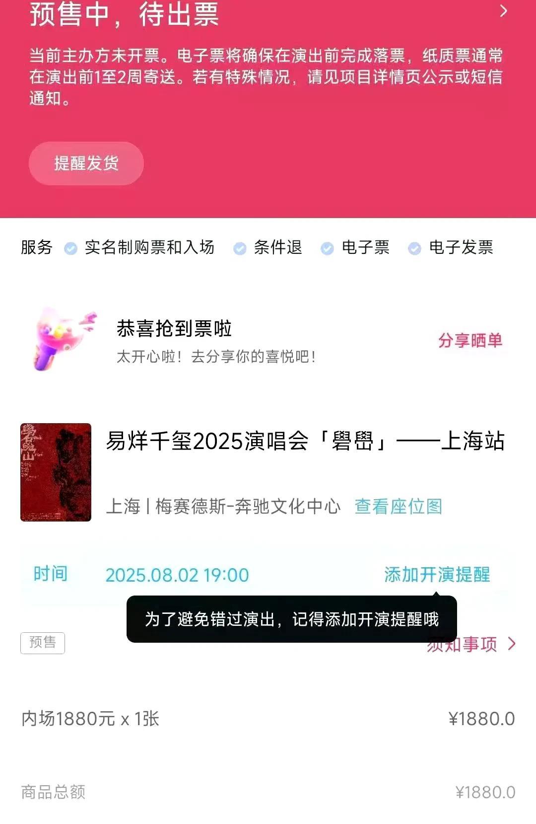 粉丝狂喜!成功抢到易烊千玺演唱会门票,激动到落泪难掩喜悦 “抢到了啊啊啊!”成功拿下易烊千玺演唱会门票的粉丝难掩激动,连发感叹宣泄狂喜。从抢票时的紧张期待到确认成功后的瞬间破防,一句“我哭了我真的哭哭”道尽追星路上的欣喜与不易,这份来之不易的门票让粉丝的期待与喜悦彻底释放。