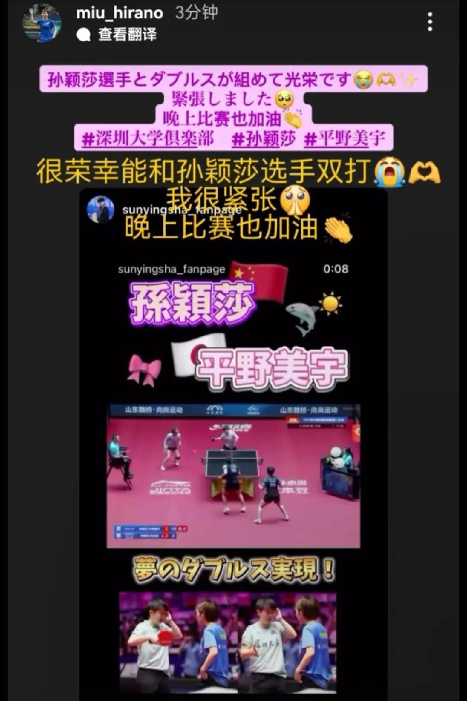 平野美宇和莎莎组女双,很开心也很紧张,连着发了两条ins,都是发的和莎莎一起比赛的照片。 看得出来,平野在中国打俱乐部很开心,只要和中国队员有交流,有互动,不管是喝杯奶茶还是打个招呼,她都很开心的在纪录,更别说和世一配双打了[偷笑]。