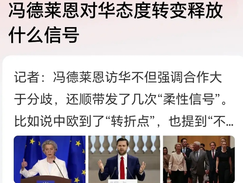 啥信号?就是来玩平衡的。就是想告诉美国,你再这样我就和龙哥好了。心其实还是在美国那里,只要川子给她一个眼神,就屁颠屁颠跑美国床上去了。 川子搞极限施压,冯妹玩脚踏两只船。都不是省油的灯。 我们对欧洲也不抱什么希望,我们的战略在一带一路,在金砖国家,在上合组织,在国际调解院……这才是我们的方向,至于欧美老牌列强,大家你好我好大家好,有钱就赚点,没钱也无所谓,只要别扯我后腿就行。 回去后请继续支持乌克兰,这样大毛就会更加倒向我们。我们的能源,我们的一带一路在中亚西亚都能更好地发展。