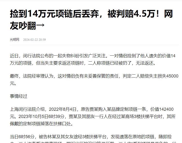 上海一男子,和女友逛商场,捡到一条价值14万的某品牌定制项链。男子趁没人看见,赶紧装兜里。第二天,失主报警,没想到男子却说,他以为那条项链是假的,扔了。失主勃然大怒,要求男子赔14万。男子认为失主在敲诈,于是两人闹到法院! 据中国青年网报道,贾先生(化名)是一家公司老板,生日的时候,妻子送他了一条定制限量版项链,价值14万,谁也没想到,这条定制项链,会丢在商场的扶梯口,从而引发一场长达数月的纠纷。 2023 年 10 月 5 日清晨,商场里的人稀稀拉拉。贾先生和朋友像往常一样,去商场闲逛,他路过商场 3 楼的扶梯平台。他脖子上戴着的,是去年花 142400 元定制的项链,那是他心爱的物件,平常宝贝得不行。 可就在经过扶梯口时,项链不知道咋回事,扣得地方松动,结果导致项链意外滑落,掉在了地上 。贾先生当时忙着和朋友赶路,根本没发现项链丢了,就这么匆匆离开了。 没过多久,林先生(化名)和女友也逛到了 3 楼扶梯平台。林先生眼尖,瞅见地上有个黄灿灿的东西,走近一瞧,是条项链。 他左右看了看,没瞧见有人找东西,心里想着说不定是条值钱的金项链,趁没人注意,赶紧把项链揣进了自己口袋,然后若无其事地和女友离开了商场。 第二天,贾先生才发现自己珍贵的项链丢了,急得不行。他赶紧回到商场,调看监控,这才发现是林先生捡走了项链。贾先生赶忙报了警,警察很快找到了林先生。 可让贾先生没想到的是,林先生竟然说,他以为那项链是假的,看着不值钱,回家后就把项链给扔了,扔在了小区草坪,也无法证明项链后又被谁捡走,现在根本拿不出来。 贾先生一听,肺都要气炸了,自己 14 万的定制项链,就这么被林先生弄丢,他要求林先生赔偿 14 万。可林先生觉得贾先生是在敲诈,自己不过捡了个不知名的项链,凭啥赔这么多,双方闹得不可开交,最后只能对簿公堂。 法院审理时,查看了商场的监控,也调取了派出所的询问笔录。林先生在笔录里说,当时看项链是黄色的,以为是黄金的才捡走,可他捡走后,既没好好保管,也没想着寻找失主,还轻易把疑似贵重物品丢弃,存在重大过失。 而贾先生,能提供购买项链的凭证,证明项链价值 142400 元。但考虑到案涉物品系定制品,从国外代购,存在代购费用支出,且原告已佩戴一年有余,亦存在折旧。 最终,法院判定林先生未妥善保管捡到的物品,存在重大过失,需要赔偿贾先生 45000 元 。 这事在网上传开后,网友们议论纷纷。有人说:“捡了东西就该好好保管,要么找失主归还,这是基本的道德和法律义务,哪能随便扔了,该赔!” 也有人觉得:“虽说捡东西没还不对,但失主自己也有责任,咋就把这么贵的项链弄丢了呢?不过林先生处理方式太离谱,捡到疑似贵重物品,怎么着也得留个心眼,不能说扔就扔。” 对于这件事情,大家有什么看法? 信息来源:中国青年网