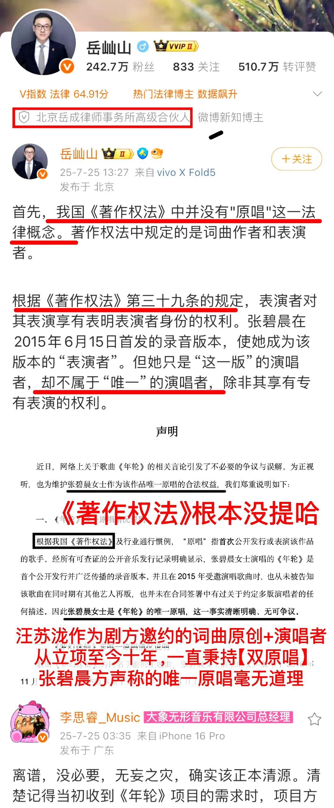 创作型歌手的难,懂的都懂。《年轮》能火,哪是单靠谁? 还不是沾了《花千骨》的光。张碧晨和汪苏泷团队怕是没聊透,为口气争高低多不值。 说到底,版权在哪,答案明明白白,别让好歌被这些绊住脚啊。