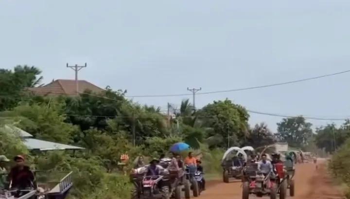 柬埔寨边境的公路上,一列列手扶拖拉机正载着民众缓缓撤离,车斗里堆满了简单的行囊。