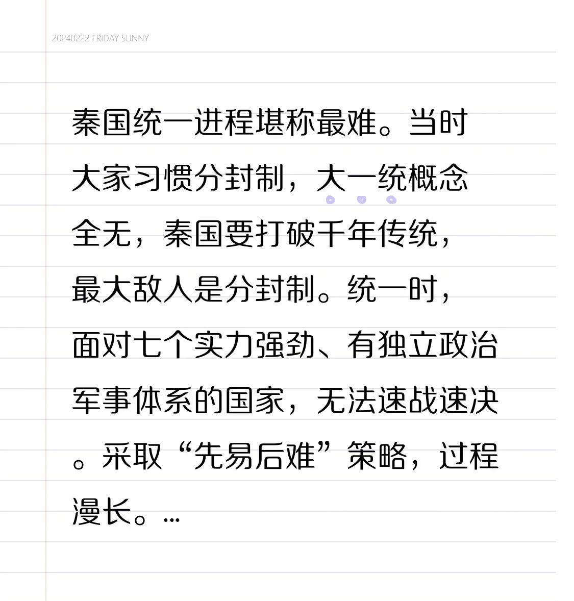 秦国统一进程堪称最难。当时大家习惯分封制,大一统概念全无,秦国要打破千年传统,最