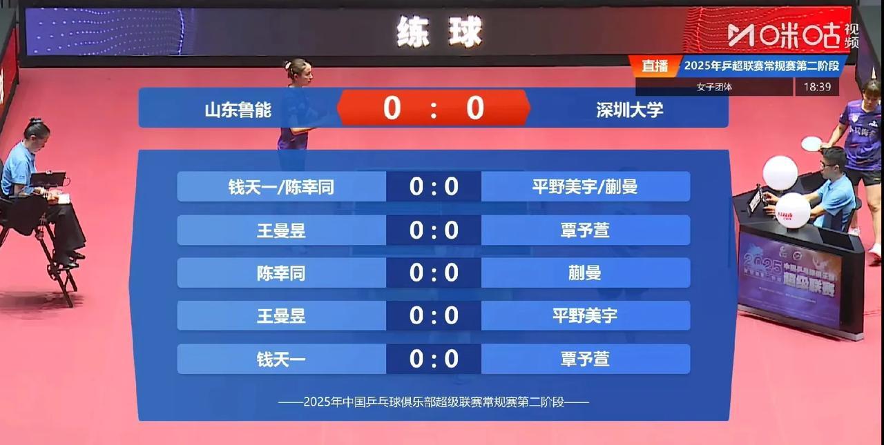 莎莎和蒯曼轮休 深圳大学VS山东鲁能(3号桌), 看到深大的排兵布阵, 好高明好机智, 覃予萱一单, 平野美宇二单, 蒯曼三单, 莎莎和蒯曼轮休, 马上孙指导上线。 山东鲁能是拿出了决赛阵容, 比赛会很有看点。 对深大来说是没有任何压力和负担, 输了涨经验,赢了赚, 大家说是这个理儿吧, 比赛马上开始, 期待两队精彩比赛, 评论区一起观赛为双方运动员加油吧!