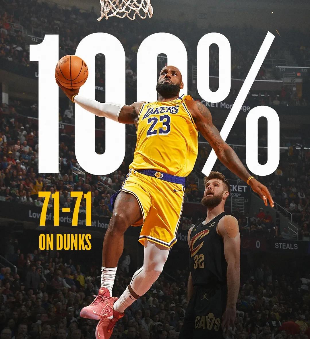 41岁还在空中作业! 71次扣篮,零失手,NBA史上第一次。 詹姆斯第22个赛季