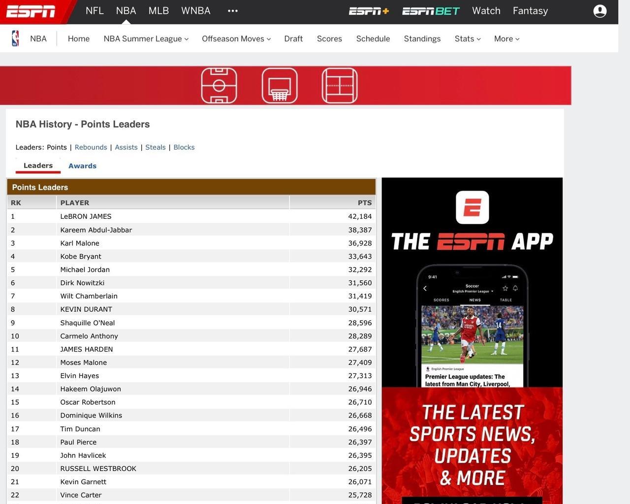 麦迪在得分上就是个笑话,上来挺猛,还拿了两届得分王,本以为他能25000+,结果到退役了不到18000