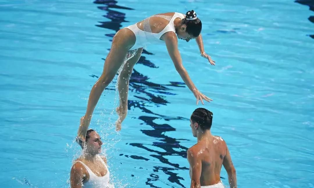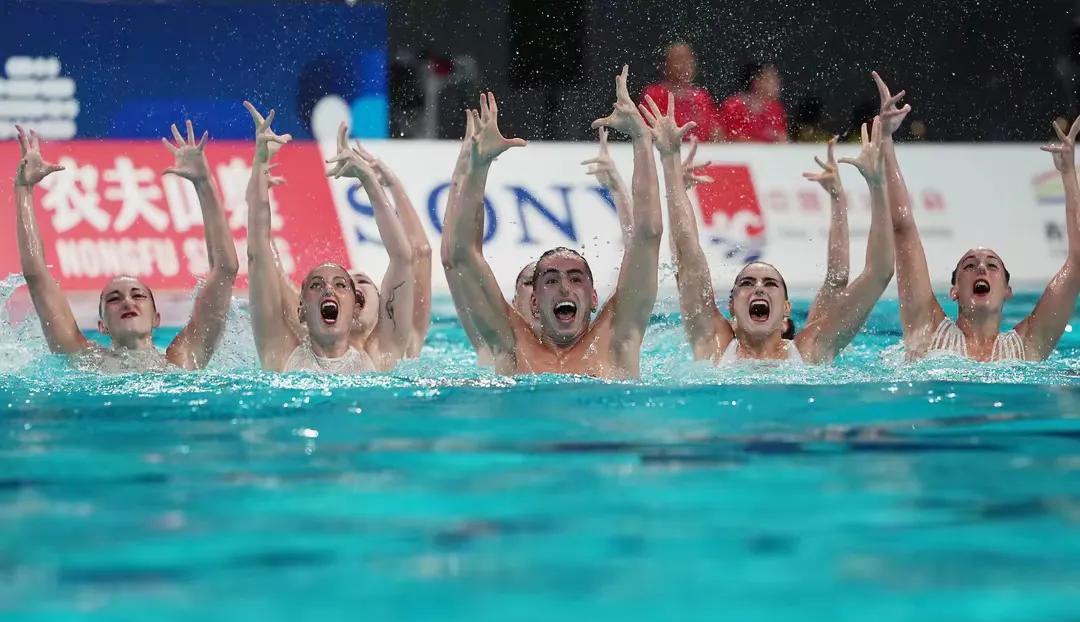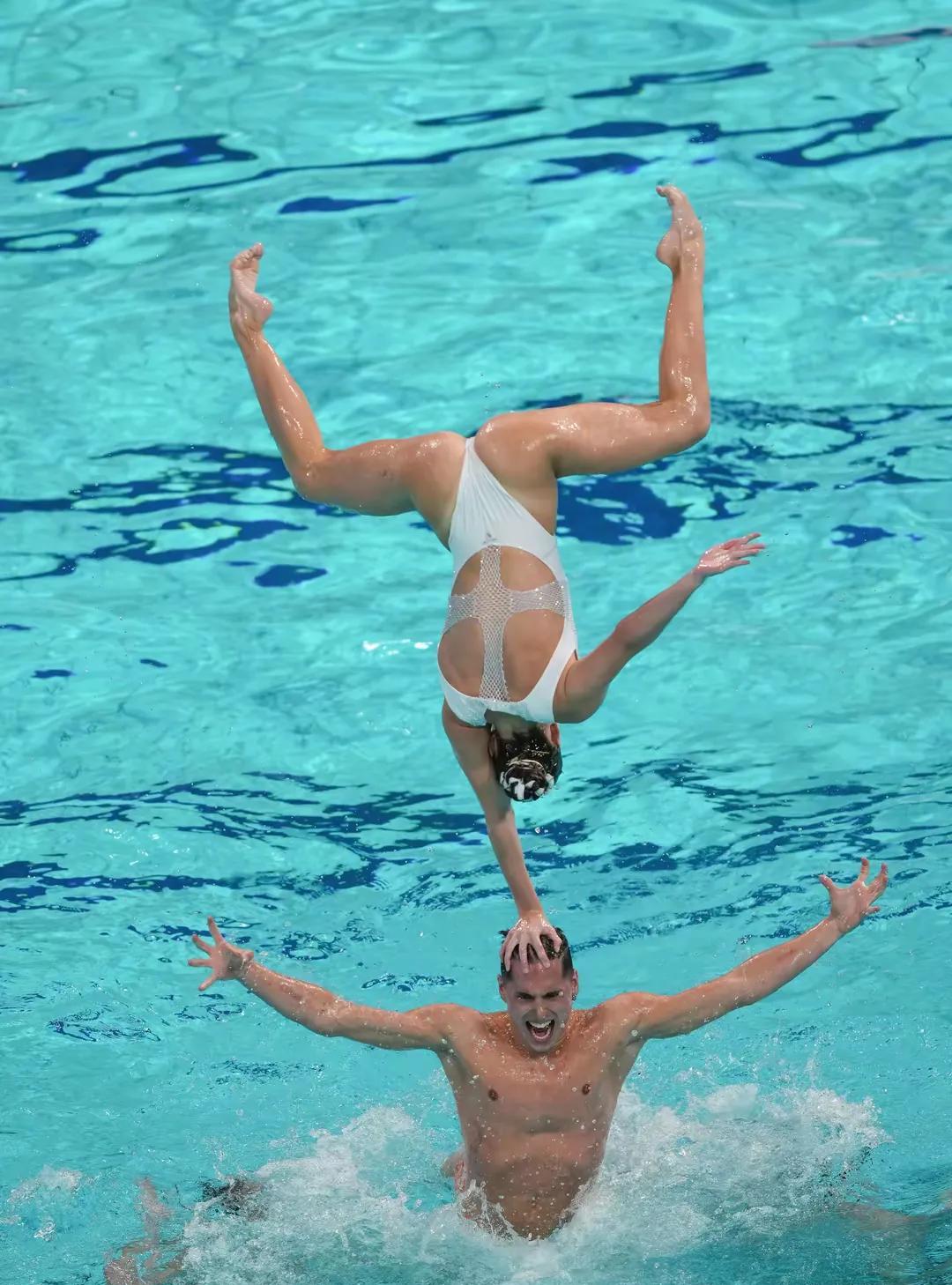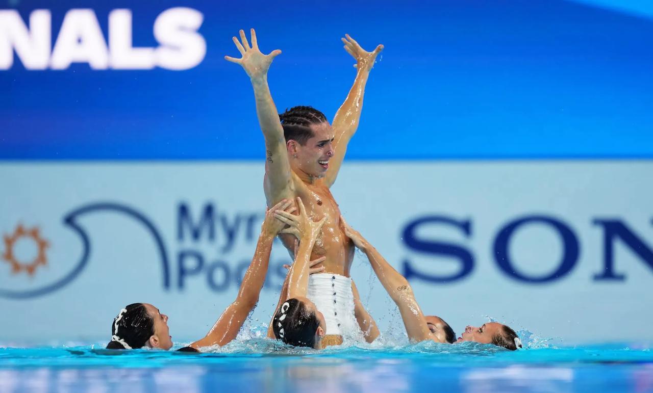 新加坡游泳世锦赛花样游泳集体技巧自选决赛,其他队伍是清一色的女队员,而西班牙队派出一位男选手,万红丛中一点绿,组合出与众不同的别样画面。