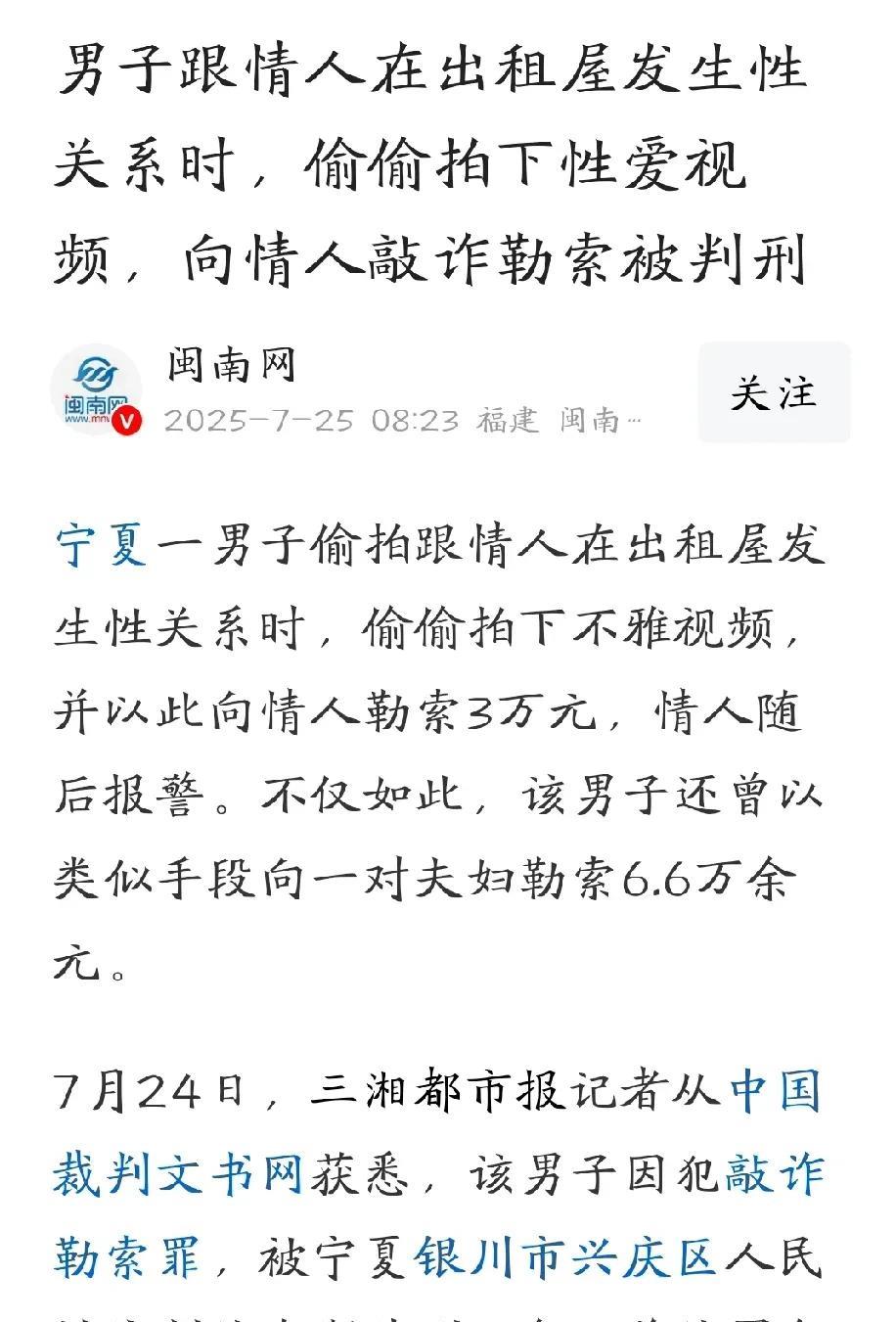 宁夏银川,男子偶然结识女子后,发展成情 人关系,两人多次在出租屋发生关系。期间,男子不讲武德,悄悄在出租屋装了监控,拍下两人亲密的视频。几个月后,女子意识到这样不对,要求结束这段关系,男子不愿意,以隐私视频威胁,索要30000元,不然就将视频发到物业群里。女子知道对方是个无底洞,果断报警,通过调查,男子背后的行为更让人大跌眼镜。 7月25日,闽南网报道了一件让人瞠目结舌的事情,网友直呼:不讲武德。 王某系宁夏固原人,2023年11月份,朋友买房叫他过去参谋参谋,过程中,他结识了女子穆某。 俩人互生好感,当即留下联系方式,一来二去,就发展成了情 人关系,经常在王某的出租屋里发生关系。 王某这人心眼多,他瞒着穆某,偷偷在出租屋里装了摄像头,把俩人亲热的过程全部拍下来了。 他当时心里就琢磨着,这视频说不定以后能派上用场。 因为摄像头装的地方及其隐蔽,穆某一直没有发现,她也高估了王某的底线,没往那方面想。 2024年8月,穆某意识到双方这样做是不对的,突然就想结束这段关系,但王某死活不同意。 穆某不再理睬王某,原本想着通过冷处理的方式,搁置这段关系,谁知,被逼急了的王某,竟然将两人的亲密视频和照片等,发给了穆某,威胁她见面并和好。 看到视频的那一刻,穆某眼前一黑,她从来没有想过,王某竟然如此没有下线,能干出偷 拍这种事情,这也让她更坚定了分手的想法。 再次遭到拒绝的王某恼羞成怒,既然挽回不了感情,那就捞点好处,他狮子大开口,要穆某给他3万块钱。 不然,就把那些图片和视频发到穆某所在的小区物业群里,让她在邻居面前抬不起头来。 穆某又气又怕,但她知道,王某就是个无底洞,这次给了,他次次回来索要,思来想去,她决定报警,很快,王某就落网了。 警方通过调查,竟发现,王某可不是头一回干这种缺德事。 2023年12月,他在网上认识了一对夫妇,并偷偷拍了夫妻两人的不 雅视频。 事后,他手头比较紧,急需用钱,就拿视频去勒索对方,张口就要6.6万。 对方很害怕,这种视频要是传出去被身边的人看到,那简直就是没脸见人,会被人戳脊梁骨,于是,赶紧给王某转了2万块钱,想破财消灾。 万万没想到,转完钱之后,对方发现,王某不讲诚信,根本就没把视频删除。 一是为了防止视频流出,二是怕王某再次威胁勒索,对方果断报警。王某见事情败露,便把钱退给了对方。 法院经过调查审理,认定王某通过公开隐私视频相威胁,使穆某和另一对夫妻产生心理恐惧,迫使对方支付钱财,共计9.6万。 该行为已构成敲诈勒索,应予刑事处罚。 《刑法》第274条规定:敲诈勒索公私财物,数额较大或者多次敲诈勒索的,处三年以下有期徒刑、拘役或者管制,并处或者单处罚金;数额巨大或者有其他严重情节的,处三年以上十年以下有期徒刑,并处罚金。 根据宁夏地区标准,敲诈勒索“数额巨大”的起点为3万元。 王某两次勒索金额合计9.6万元,远超“数额巨大”标准,应处三年以上十年以下有期徒刑,并处罚金。 但《刑法》第23条规定:已经着手实行犯罪,由于犯罪分子意志以外的原因而未得逞的,是犯罪未遂。对于未遂犯,可以比照既遂犯从轻或者减轻处罚。 王某勒索一对夫妇6.6万元,但仅实际得款2万元,因被害人报警后王某退还全部款项,属于“因意志以外原因未得逞”,构成犯罪未遂。 其次,他向穆某索要3万元未果,因被害人报警而未实际获取财物,亦属犯罪未遂,可依法减轻处罚。 综上,法院最终以敲诈勒索罪,判处王某有期徒刑二年,并处罚金20000元。