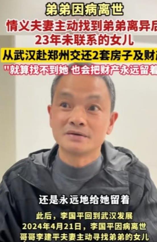 “这样的人品全国罕见!”2024年4月21日男子离异后1岁女儿判给前妻,从此再无交集!不料,23年后男子去世,哥哥竟不顾反对“千里”寻亲,主动将弟弟的2套房和存款转到素未谋面的侄女名下! “我弟弟的遗产,就算找不到他女儿,我也得给她留着!”当哥哥李建平说出这句话时,没人能想到,这份承诺背后是一段跨越23年、零血缘关联的执着坚守。 而故事的开头要从2024年4月21日说起,51岁的李国平因病离世留下一座村屋、一套城区商品房和若干存款。 可李国平的身后事,却因一段久远的离散变得复杂难办,因为他早年在郑州工作时,与当地女子成婚,女儿刚满一岁,两人便因感情破裂离异,此后李国平回到武汉蔡甸生活,和前妻、女儿彻底断了联系,而这一断就是23年。 办完丧事后,遗产处置成了摆在众人面前的难题,家族里有人知道李国平在郑州或许还有前妻和女儿,可茫茫人海,失联23年,找一个从未谋面的人谈何容易? 于是有人提议,把房产转到李建平子女名下,简单了事,可李建平却一口回绝,他认定弟弟的遗产该归侄女,哪怕找不到人也绝不能动一分一毫,后来妻子乐小红也全力支持,夫妻俩铁了心要完成这场“寻亲接力”。 随后李建平的儿子偶尔去郑州出差,都会顺手打听侄女的消息,可惜一直毫无收获,李建平夫妇很少出远门,唯一一次去郑州还是弟弟当年结婚的时候。 于是在2025年2月28日,夫妻俩踏上寻亲路。他们找到弟弟从前的朋友,辗转打听到前妻曾工作的地方,却早已物是人非。 好在乐小红灵机一动,想到弟弟在郑州结的婚,民政部门或许有档案,从郑州市民政局到区民政局,工作人员被这份执着打动翻出尘封多年的资料,锁定了前妻曾居住的社区。 而社区民警得知情况,也热心帮忙,指导李建平联系老家梅池村党支部书记开证明,每一步都走得艰难,却又满是希望。 后来在郑州警方和社区的合力帮助下,消息终于传来:李国平的前妻在侄女10岁时就已去世,侄女跟着姨妈长大,正在高校读大四。 直到3月13日,失联23年的亲人相见,李建平夫妇看着侄女眉眼间像极了弟弟,忍不住红了眼。 乐小红抱住侄女,眼泪止不住地流,这场跨越山海的奔赴,终于有了温暖的回响,因为侄女学业忙,李建平约好等暑假带她回蔡甸办遗产继承手续,让弟弟的遗产真正回到该去的地方。 这事传到网上网友们炸开了锅:有人说:“这才是真正的人间真情!换成别人,早把遗产吞了,哪会大费周章找一个陌生人?” 也有人感慨:“23年啊,零血缘关系,还能坚守道义,这家人的人品,真的全国罕见!” 在“遗产争夺”常被贴上“利益熏心”标签的当下,李建平夫妇的选择,像一把利刃撕开世俗的刻板印象,他们用行动证明不是所有亲人离世后的遗产处理,都充斥着算计还有这样纯粹的道义,跨越时间和血缘熠熠生辉。 其实生活里常能看到遗产纠纷闹上法庭、亲人反目的戏码,可李建平夫妇的故事偏偏逆着“剧本”来。 他们本可以轻松收下遗产,却偏要自找麻烦,跨省寻亲只为给一个素未谋面的女孩“送”财产,这不是傻,是刻在骨子里的善良是中国人对“义”字最朴素的坚守。 或许有人会问,23年的失联,真值得这么拼吗?李建平夫妇用行动回答:值得。 那么你怎么看待这件事呢? 信源:湖北日报