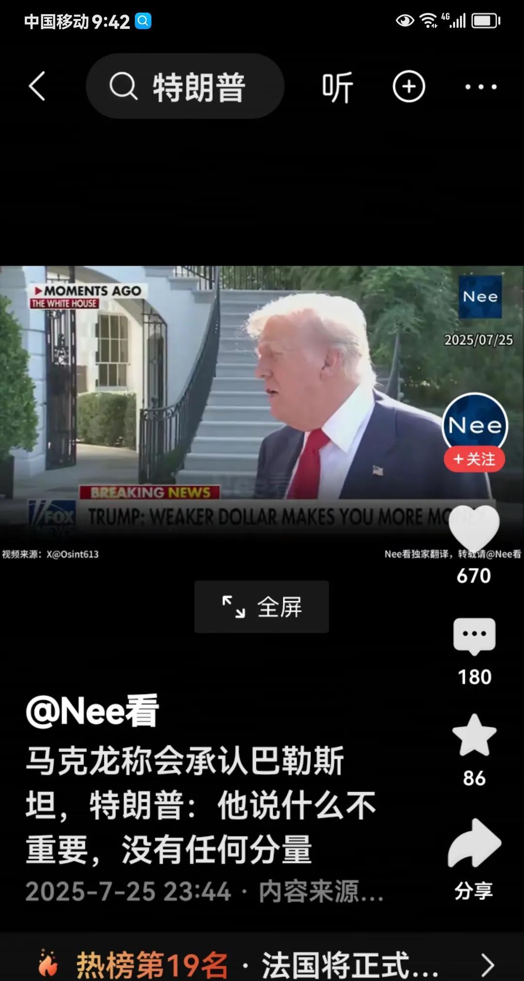 太蔑视人了,特朗普今天公开炮轰马克龙,说他的声明“没有任何份量”。 起因是这样的:7月24日,马克龙表态承认巴勒斯坦国。 7月25日,美国媒体采访特朗普,问他对马克龙这个表态怎么看。 结果特朗普当场笑了,而且笑的很灿烂。 他直接说:马克龙是个好人,但他说的话没有任何份量,完全不用在意。 这个意思就是说,马克龙代表法兰西大帝国,做出的这个庄严承诺,在特朗普眼里,等于放了一个P,而且是连个响都没有的那种。 来源:央视新闻。