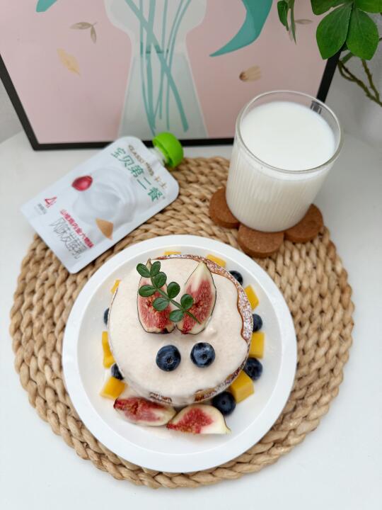 做好的松饼挤上宝贝第二餐酸奶,摆上水果就可以吃啦