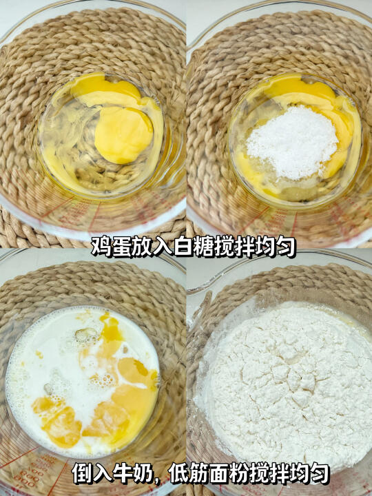 1:鸡蛋倒入白糖搅拌均匀,在倒入牛奶,低筋面粉搅拌均匀。