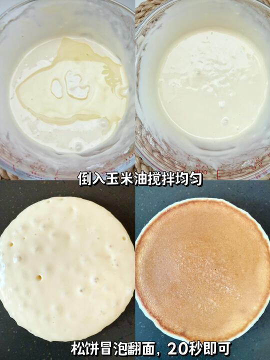 2:面糊中倒入玉米油搅拌均匀,放入适量面糊在平底锅,上面冒泡翻面,20秒就可以出锅!