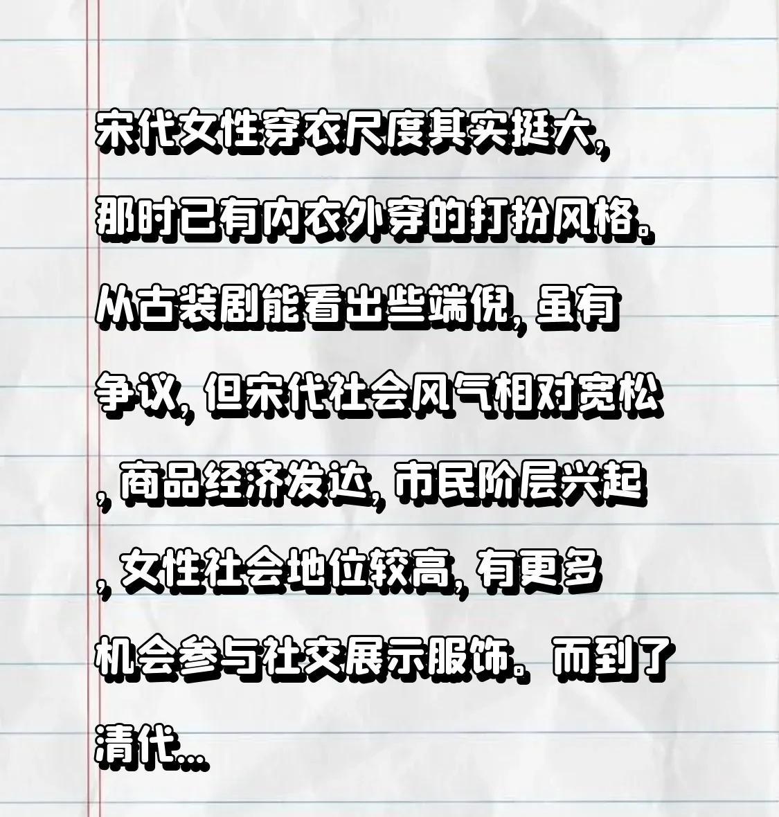 宋代女性穿衣尺度其实挺大,那时已有内衣外穿的打扮风格。从古装剧能看出些端倪,虽有争议,但宋代社会风气相对宽松,商品经济发达,市民阶层兴起,女性社会地位较高,有更多机会参与社交展示服饰。而到了清代,服饰变得保守臃肿,从达官贵人到青楼女子,都被要求穿着得体,缺乏女性美和服饰多样性。这和当时文化思想、社会风气、经济因素都有关,宋代宽松,清代却受程朱理学深远影响,对女性约束更多。