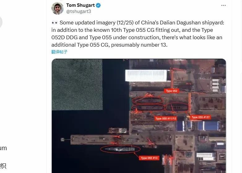 055的建造数量,西方媒体应可劲的往最大数字猜。 西方卫星盯着造船厂看,看着看着,第13艘055的趋形就出来了,这打破了西方路边社关于055建造数量的猜测,因为它还只看了达利安船厂,他们还没有往江南造船厂看看。 图一是Tom Shugart在社交媒体发布的推文 ,他是美国从潜艇退役的军官,现为海军和海洋安全领域的分析师、研究员,常就各国海军力量发展等议题发表观点。 Tom Shugart在分析一张中国达利安造船厂2024年12月的影像时发现,除已知正在舾装的第10艘055型巡洋舰外(国外均不认为055是驱逐舰),发现还有一艘052D型驱逐舰与两艘055型在建,其中一艘是最近才展现出的055型巡洋舰的轮廓,推测编号为13 。 Tom Shugart还没有看江南造船厂,在这里,9号舰于2023年12月31日下水。根据美媒《Horobeyo》1月12日发布的消息,该舰已完成舾装,进入海试阶段,预计2025年末服役,据第一批055建造情况,这里也应该有三艘,根据Tom Shugart的观测时间推,这里可能还有新的055在造。 据《海军新闻》《防务新闻》称055第二批造8艘,使得055增加到16艘。 无论是西方的自媒体,还有西方的权威媒体,他们都受到了建造产能与成本等因素困扰,不敢往大数字猜。要知道,东方不是西方,这里有世界最大的船舶产能,东大也不是西大,这里的东西在技术高一个档次的情况下,成本可能只有其八分之一,甚至更大。 无论是6艘,还是8艘,西方媒体都显得过份保守,个人认为,打底16艘,要知道,052D的第二批就有14艘。