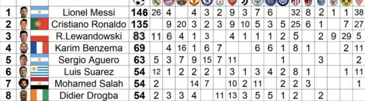 对战欧洲顶级球队战绩,梅西&C罗断崖领先 梅西踢进146球,分别是: 塞维利