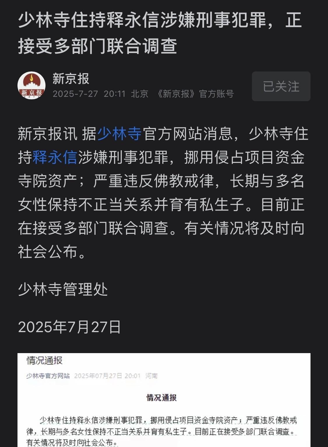 中国佛教最有权力的“官”,少林寺方丈释永信终于被公众宣布“被抓走被调查”了!奇怪