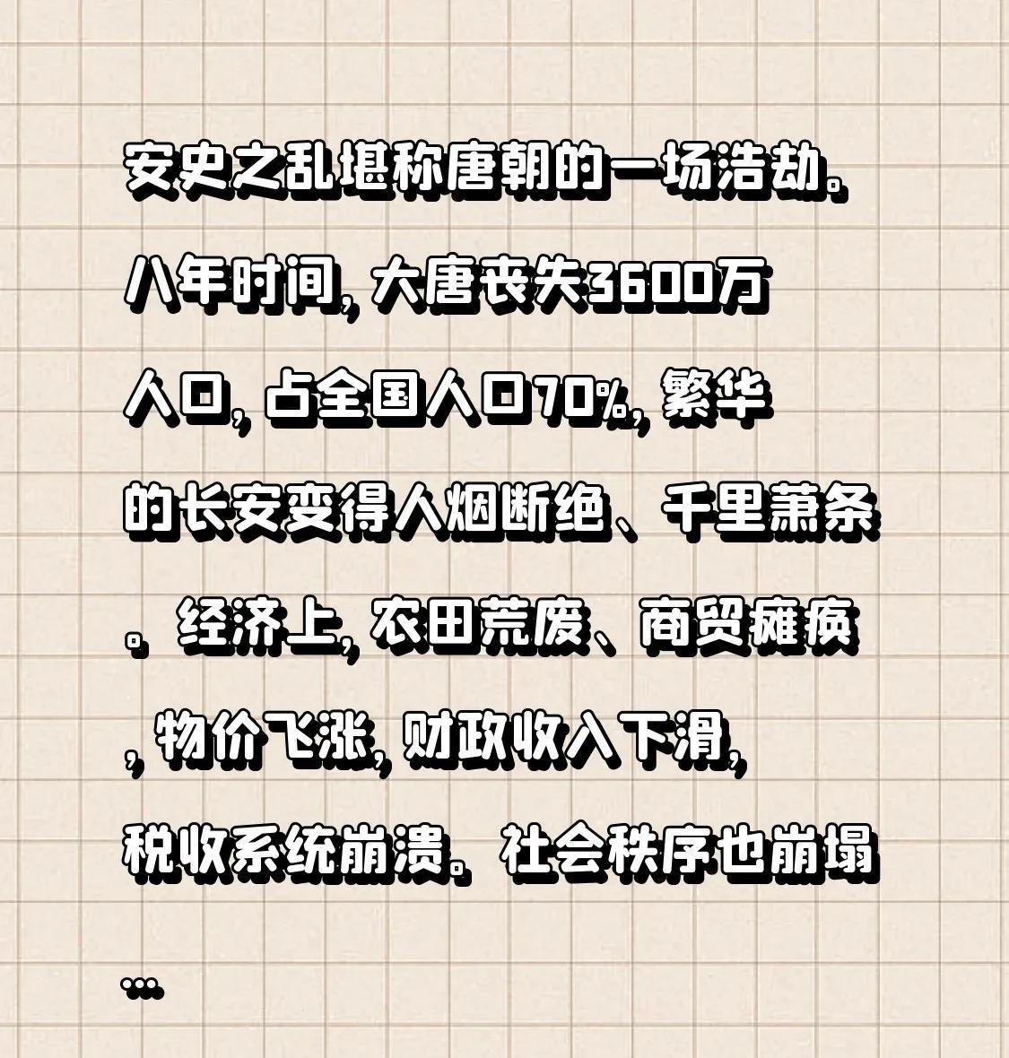 安史之乱堪称唐朝的一场浩劫。八年时间,大唐丧失3600万人口,占全国人口70%,繁华的长安变得人烟断绝、千里萧条。 经济上,农田荒废、商贸瘫痪,物价飞涨,财政收入下滑,税收系统崩溃。社会秩序也崩塌了,百姓死于战火,流民众多,盗匪横行。政治上,地方藩镇崛起,中央集权失衡,政令难通。曾经盛极一时的唐朝,经此一乱,直接走向衰落。