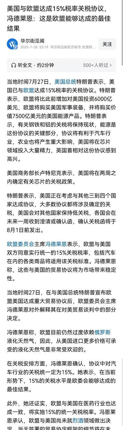 冯德莱恩完成美国人的任务了,把欧洲彻底卖给了美国,川普宣布美欧达成协议,关税降到