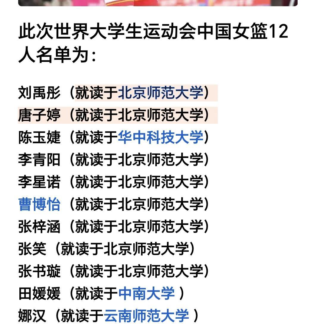 大运会女篮冠军成色如何?不要沾沾自喜也不要妄自菲薄,扒一扒德国大运会女篮决赛中国大运会女篮和美国女篮在各自国家到底是什么水平?先来说说中国女篮,基本就是以去年CUBA的亚军北师大女篮为班底组建的,我们我们熟悉的刘禹彤、唐子婷和陈玉婕都是北师大的,包括教练李笋南也是北师大教授。那么去年的CUBA冠军是谁呢?是北大女篮,但是翻看12人大名单居然一个北大的球员也没有,这也挺奇怪!不过既然是以北师大为班底,找击败她们的北大球员一起打球配合起来可能也有罅隙吧? 代表美国大运女篮是基本就是全部以德州理工大学为班底,那么这支球队实力如何呢?综合实力应该在全美高校属于中上游水平,但是她们基本无缘参加美国大学的顶级联赛NCAA联赛(中国球员邓雨婷所在的奥本大学时候参加NCAA联赛的),只能参加比NCAA更低的联赛WBIT,如果非要给这支队伍排名大概位列美国高校的第70名左右,而代表美国参加美洲杯的那支队伍才是由美国大学NCAA的主力球员组成的。我们拿到了冠军就是冠军不用质疑,但是也不要沾沾自喜,对于中美大学球员的水平和实力也要有清醒的认识!