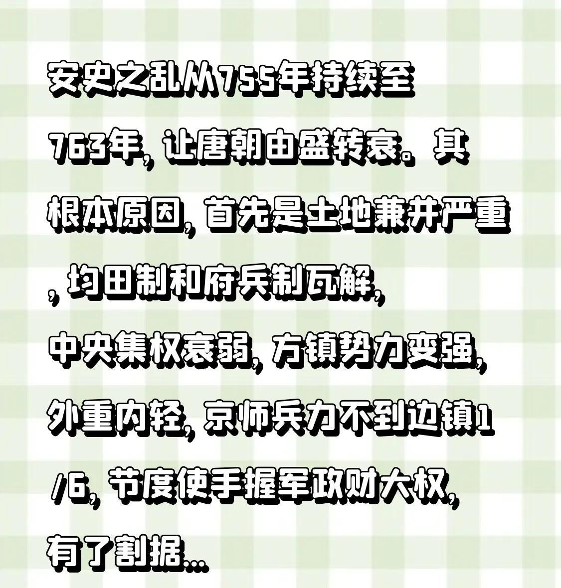 安史之乱从755年持续至763年,让唐朝由盛转衰。其根本原因,首先是土地兼并严重,均田制和府兵制瓦解,中央集权衰弱,方镇势力变强,外重内轻,京师兵力不到边镇1/6,节度使手握军政财大权,有了割据条件。 再者,安禄山狡诈善迎,获玄宗信任,身兼三镇节度使,拥兵超15万。杨国忠与他矛盾冲突成了导火线。还有,玄宗后期骄奢,宠杨贵妃、用奸臣,朝政腐败,社会矛盾激化,给了叛乱可乘之机。
