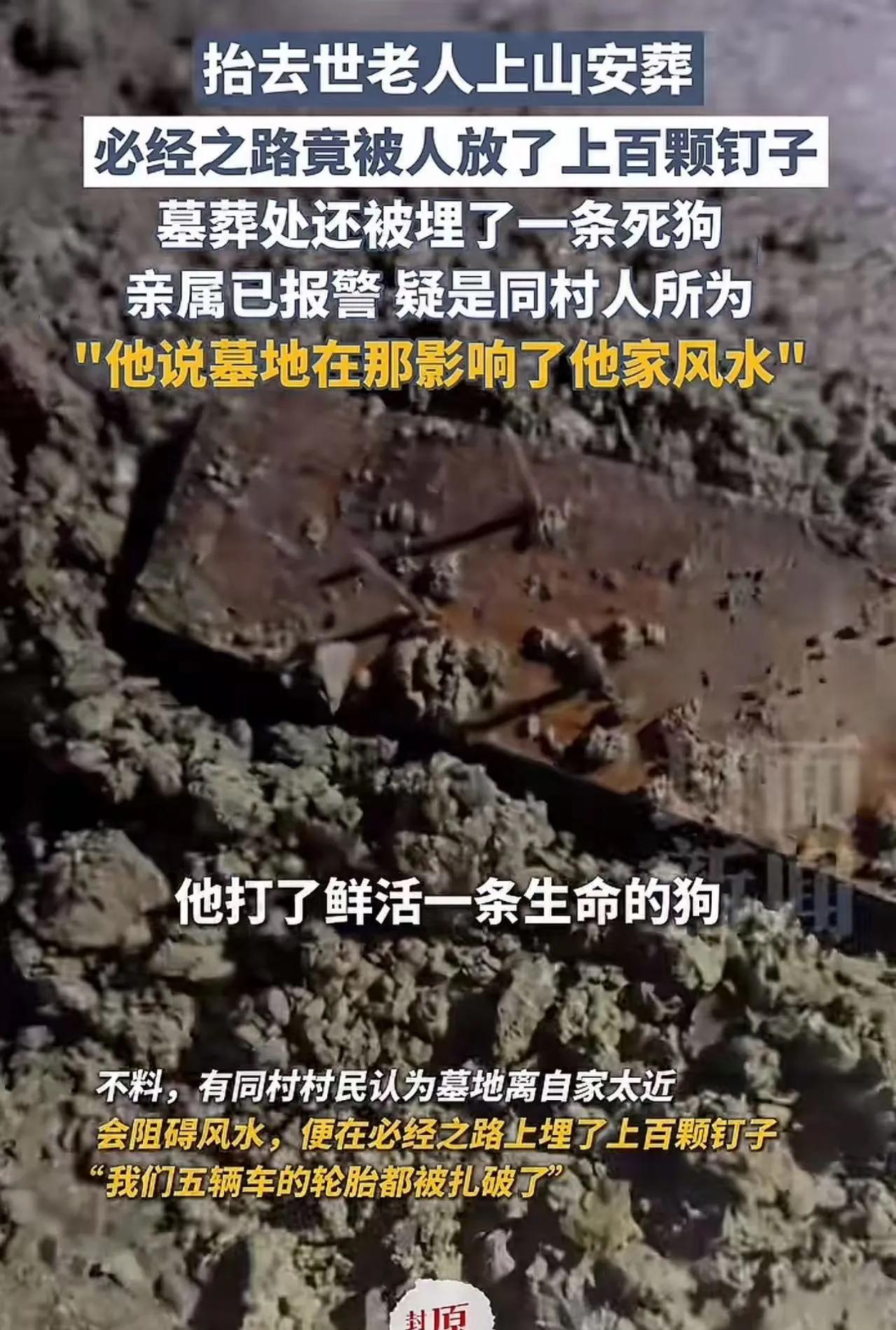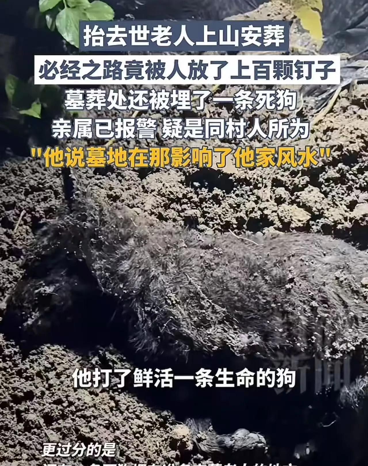 “真是个狠人!”重庆,家人抬去世老人上山安葬,必经之路竟然被人放了上百颗钉子,更让人愤怒的是,墓葬里面还被人埋了一条死狗!亲属:“已报警,疑是同村人所为,他说墓地在那影响了他家风水,想用这种方式阻止我们下葬。” (来源:封面新闻) 近日,在重庆市酉阳县泔溪镇大板村,一桩令人愤慨不已的事件如阴霾般笼罩着陈先生一家。 陈先生的大伯突然去世,这本就是一件令人悲痛欲绝的事情,家人怀着沉重的心情,打算将老人安葬在自家的土地里,希望老人能入土为安。 可是,就在凌晨众人送老人上山的关键时刻,意外陡生。五辆车的轮胎竟在同一路段被钉子扎破! 当他们满心疑惑地下车查看时,眼前的景象让他们瞠目结舌,地上密密麻麻地散落着近上百颗钉子! 这样的“陷阱”,显然是有人蓄意为之。可此时老人下葬刻不容缓,众人无奈之下,只能忍着满腔的愤懑,下车步行爬山。 当他们历经艰辛,好不容易爬上山,准备将老人下葬时,更令人怒发冲冠的一幕出现了:墓穴里面竟然被人埋了一只狗! 这只狗是被人活生生打死后扔进去的,老一辈的人都说,如此恶毒的行径,其目的就是妄图破坏老人墓穴的风水。 这接二连三的恶意破坏,再加上必经之路上的钉子陷阱,种种下三滥的招数,让陈先生他们越想越气,究竟是谁如此丧心病狂,做出这般伤天害理的事情呢? 很快,他们不约而同地想到一个人身上。在大伯下葬前几天,同村一名约60岁的村民曾打电话过来,声称大伯的墓穴离他家太近,会影响他家风水。 众人由此怀疑,这一系列恶意事件很可能就是他的报复之举。于是,陈先生他们果断报案。 此事引发了热议,有网友说,、我爸走了出殡的时候也是,那天是台风大暴雨,我们同村同姓的一户人也是拦路,不让我们从他们家旁边的路经过,后来被逼着走发洪水的河里过去,我到现在都记着他们家这个大仇! 也有网友说,我们这里风俗是死者为大,不管多大的恩怨是不会使绊子的。 还有网友说,我家房子旁边和后面,都是坟,而且有三四个都是最近两年埋的,我们从来不阻拦,鬼都能住的地方,难道活人还不能住,再说鬼还没活人可怕! 在农村,丧葬文化承载着人们对逝者的尊重与缅怀,是神圣而不可侵犯的。 否则,等待他的必将是法律的严惩和道德的谴责,他也将成为众人唾弃的对象,永远被钉在道德的耻辱柱上!#头号创作者激励计划#