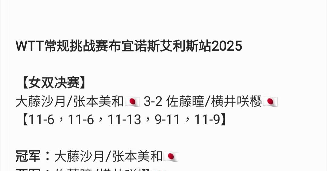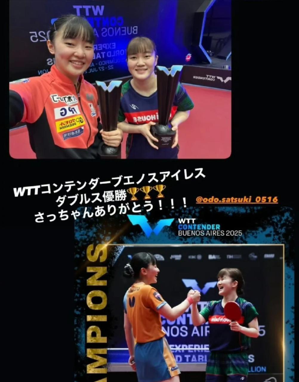张本美和夺冠后 感谢爸爸和大藤沙月 张本美和发文感谢爸爸: WTT常规挑战赛布宜诺斯艾利斯站 我拿下了女单和女双冠军, 爸爸,一直以来都谢谢你, 还有凌晨一直坚持看比赛的球迷, 接下来的巴西比赛我也会加油的! 赢得双冠, 张本美和十分高兴, 晒出自己的冠军照片, 感谢搭档大藤和爸爸的辛苦付出! 大藤沙月在1/4决赛中输给朱芊曦, 无缘奖牌! 日乒女线的竞争压力越来越大, 早田希娜现在最大的奥运700几分 也会清了,以后的冠军赛早田如果没 受到邀请可能都参加不了了……