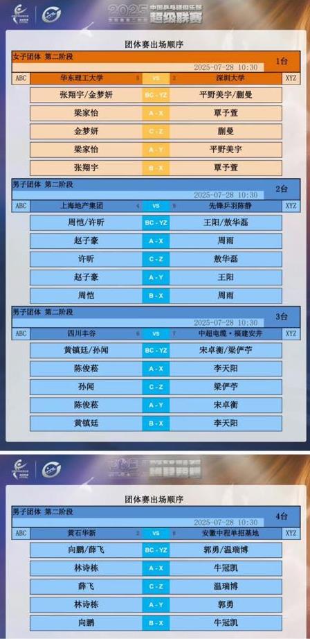 7月28日乒超联赛第二阶段最后一天华东理工VS深圳大学孙颖莎王艺迪都轮休 7
