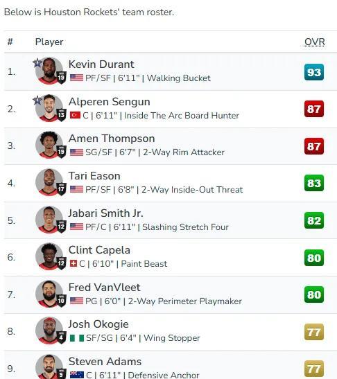 2k最新评分 杜兰特93,申京,阿门87,伊森83,小贾82,范乔丹和卡佩拉80;亚当斯,奥科吉77,电风扇76