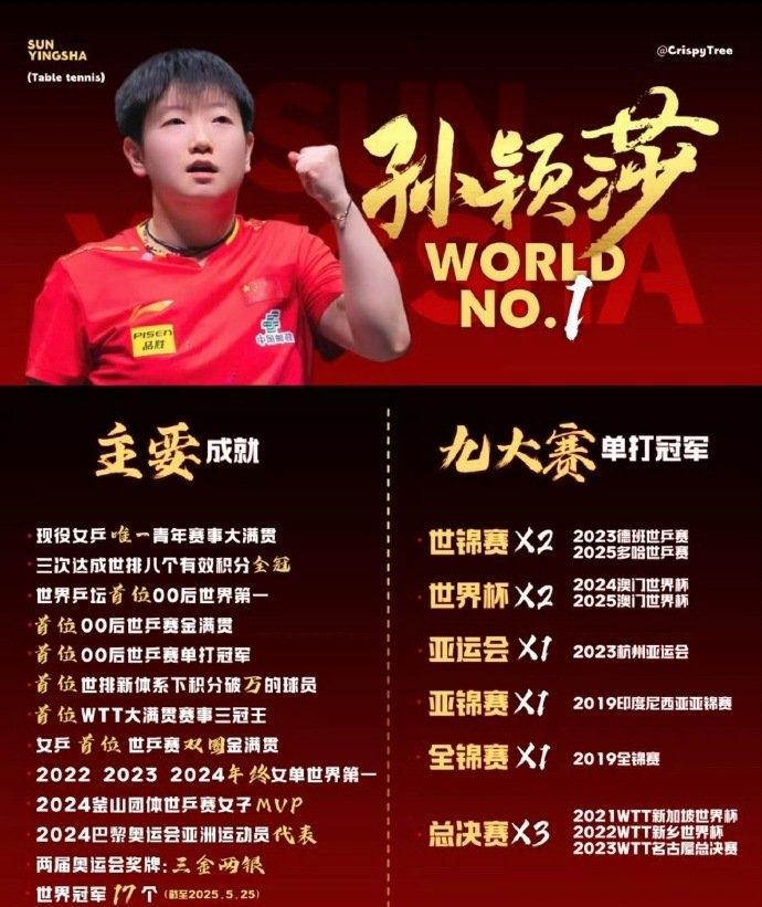 还在为厦门乒超落幕而emo?孙颖莎带着新身份来“充电”啦!作为#美团美味生活代言人#,小魔王一出手就自带“提神buff”,让坐在工位的打工人瞬间精神焕发——毕竟谁能拒绝赛场外甜度满分的“小咪美味”呢? 赛场上的孙颖莎早已是传奇在续写:手握九大赛单打冠军,世锦赛双圈金满贯、世界杯两冠加冕,更是世界乒坛首位00后世界第一、首位积分破万的新积分体系选手。从世乒赛的吉·盖斯特杯到考比伦杯、波普杯、兹·赫杜塞克杯,她用17个世界冠军头衔和“世锦赛水槌金满贯”的成就,坐稳世界第一宝座,2022-2024年连续三年锁定年终女单榜首,2024年更是以釜山世乒赛女团MVP和巴黎奥运会亚洲运动员代表的身份闪耀国际舞台。